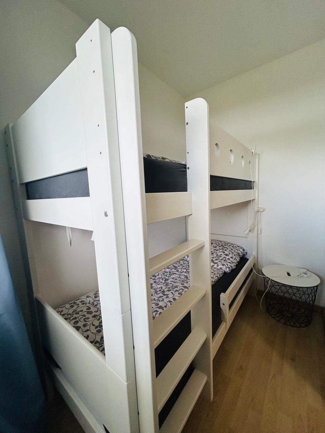 Separates kleines Zimmer mit Etagenbett, Bad mit Dusche, kleiner Flur mit Abstellraum.