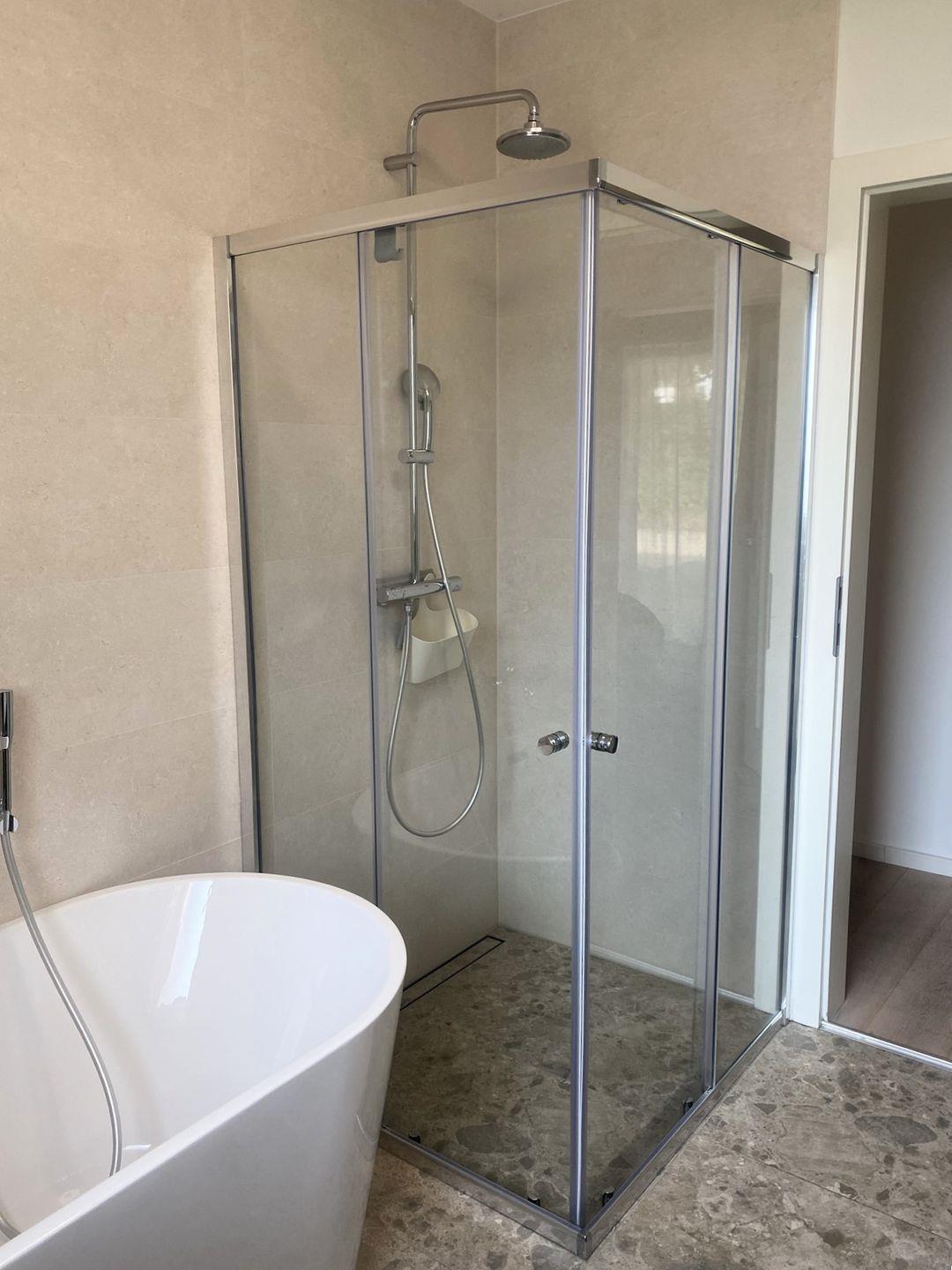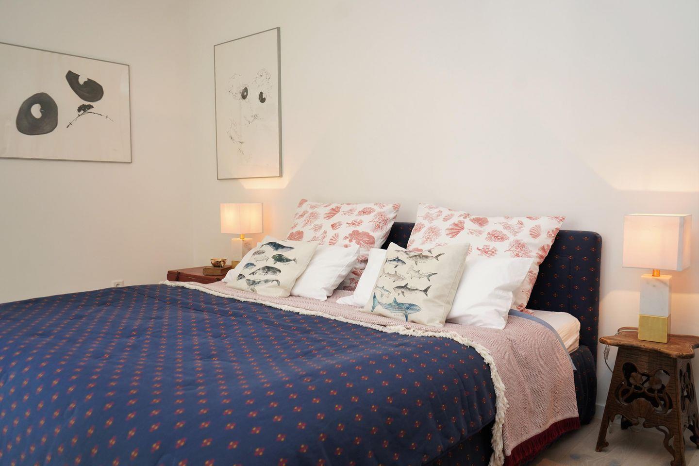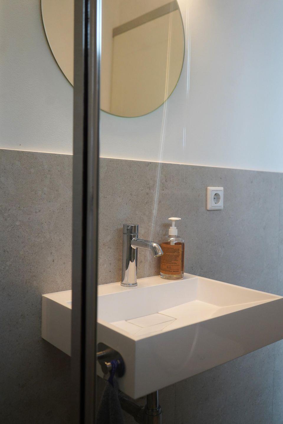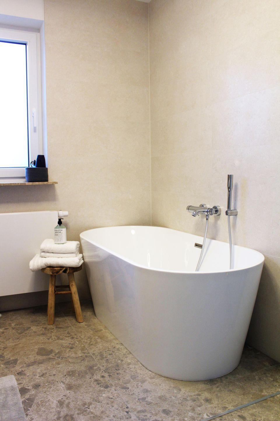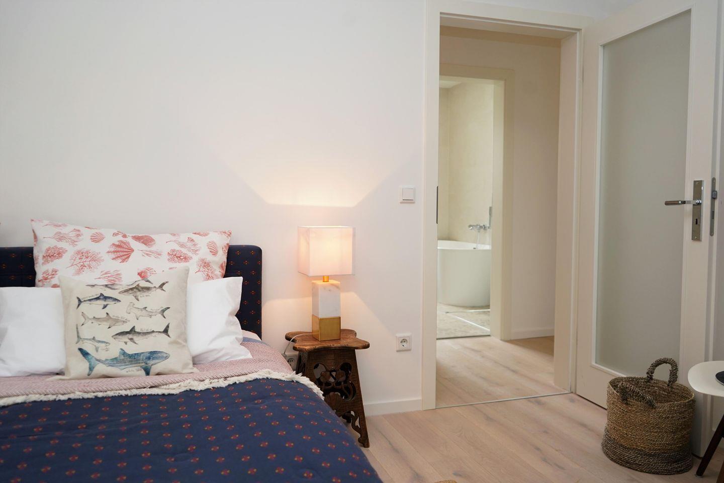 Das stilvolle Badezimmer ist mit einer freistehenden Badewanne, einer Dusche, WC und Haartrockner ausgestattet. Ein zusätzliches kleines Bad vor der Wohnung mit Dusche & WC steht exklusiv den Gästen der Wohnung zur Verfügung – ideal nach einem entspannten Tag am Strand.
