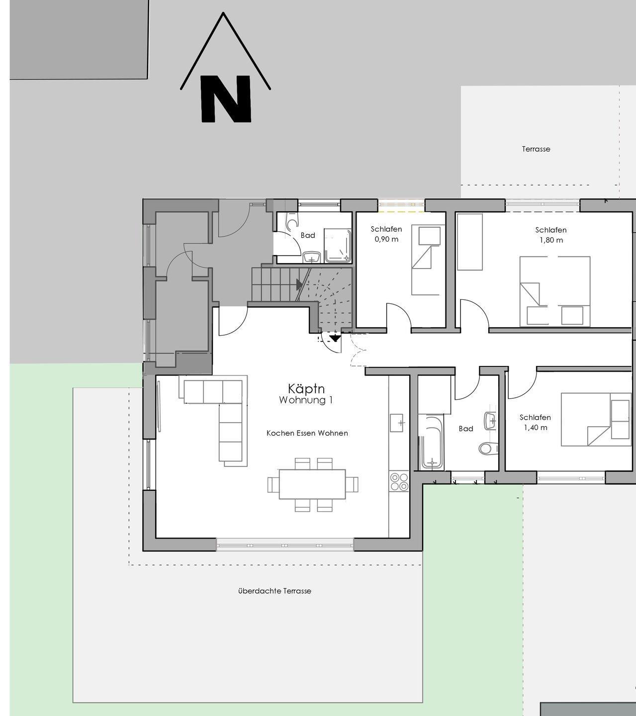 Genieße deinen Urlaub in der großzügigen Ferienwohnung „Käptn“ auf 95 m², mitten im charmanten Duhnen. Mit einer offenen Küche und einem großen Wohnbereich, der Platz für die ganze Familie bietet, ist diese Wohnung der perfekte Rückzugsort. Zwei wunderschöne Terrassen – eine überdachte mit Zugang zum Garten und eine private, direkt am Elternschlafzimmer – laden zum Entspannen ein.