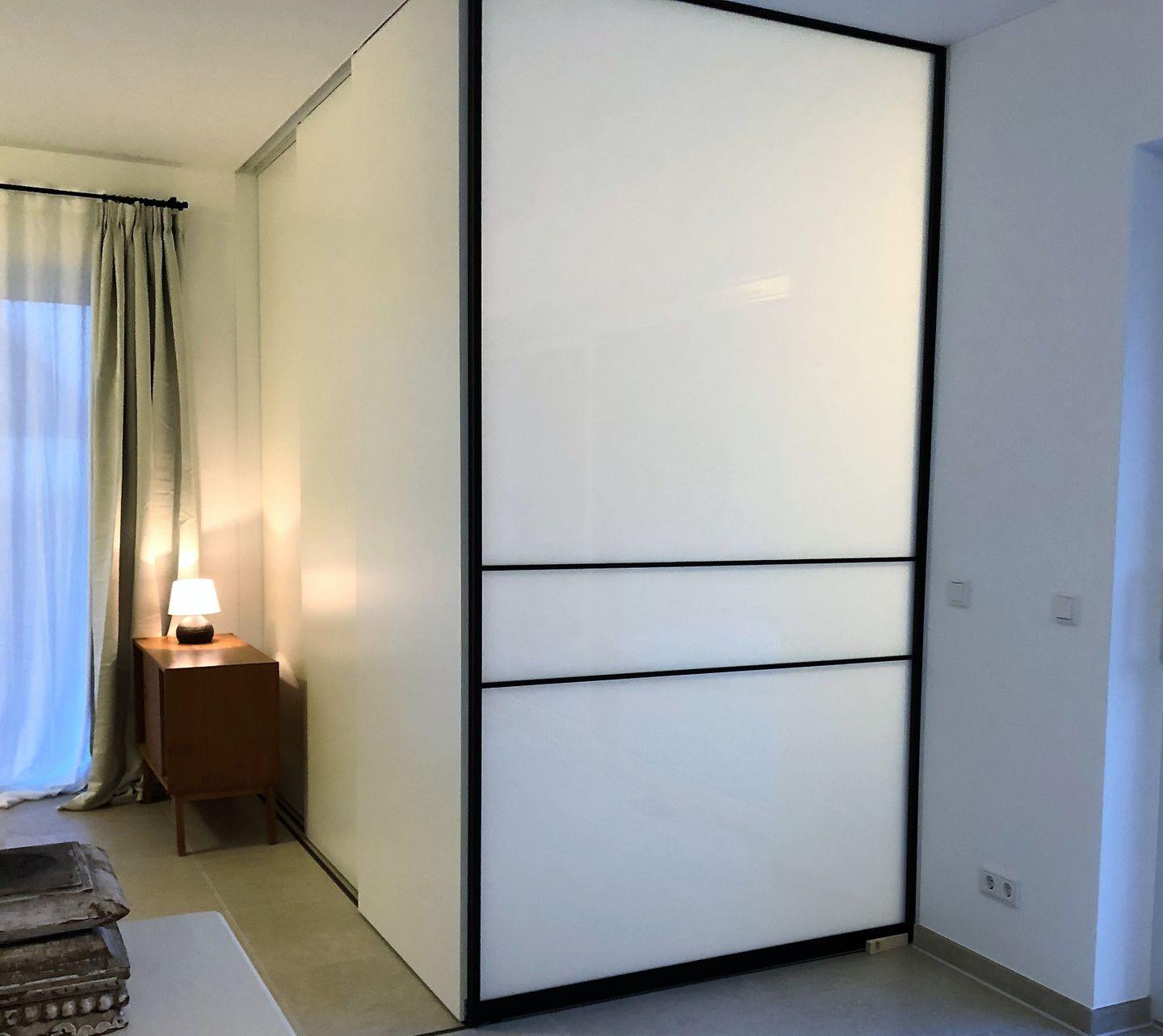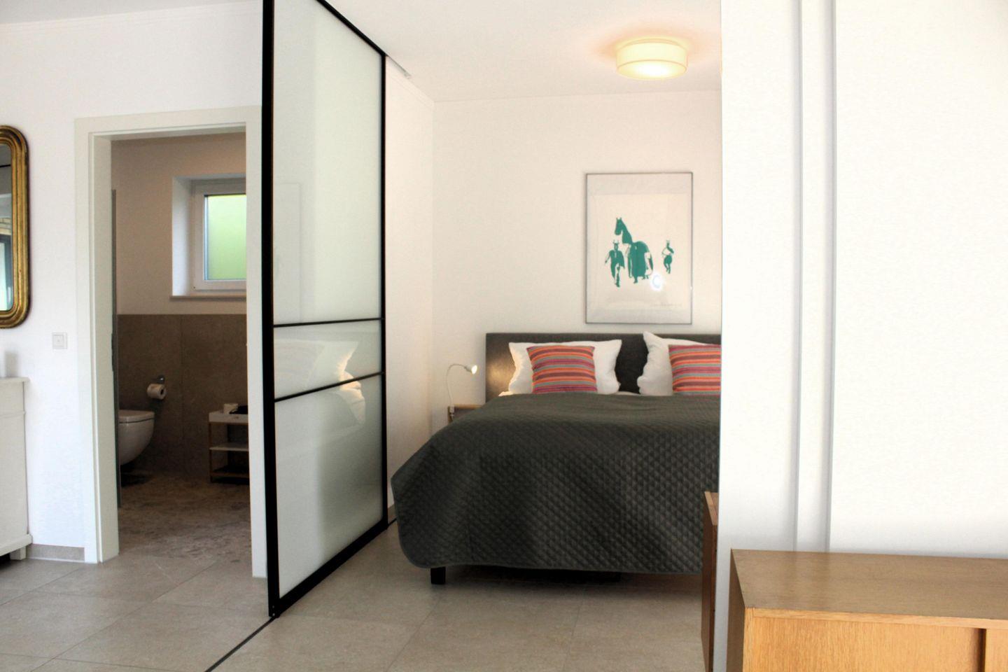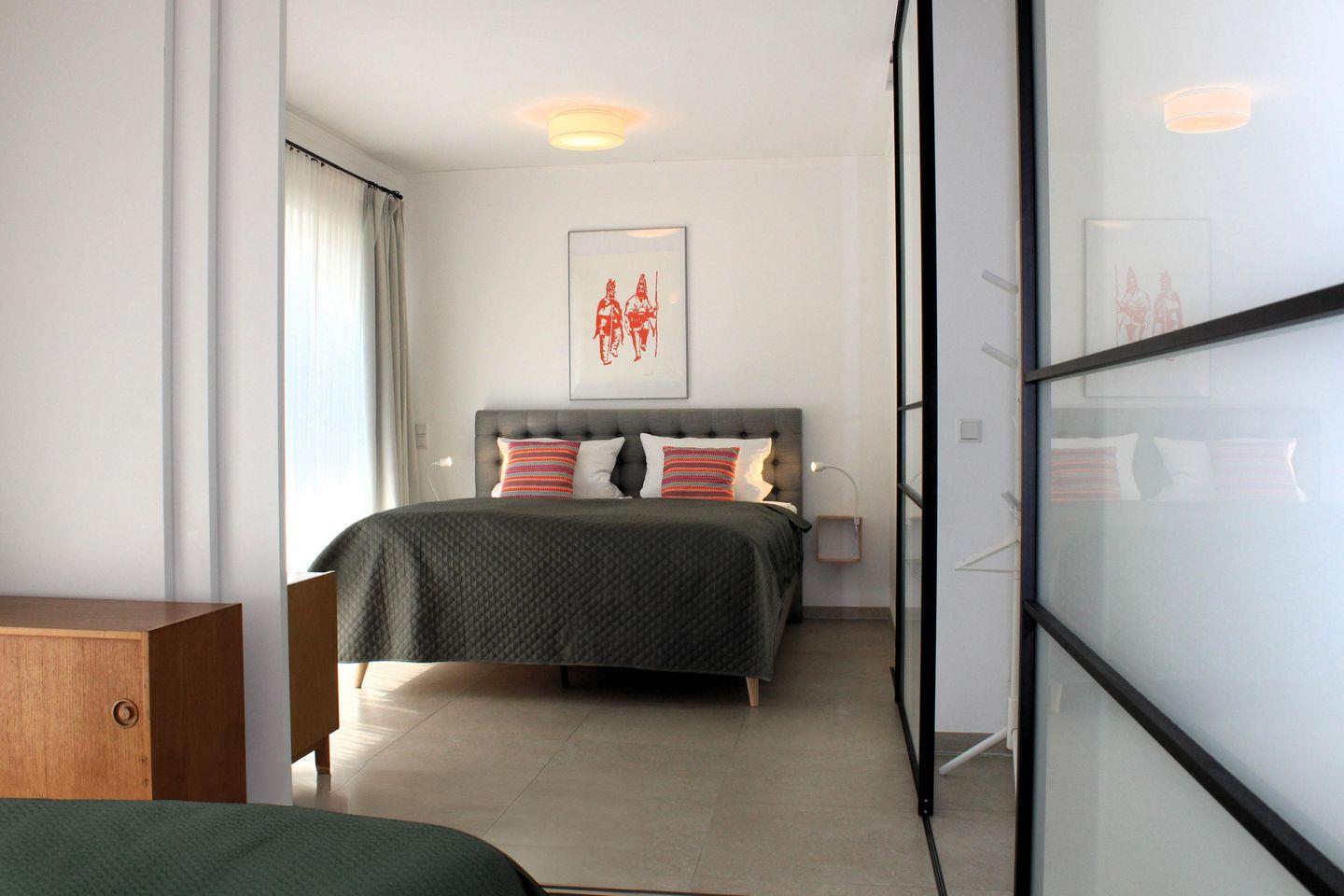 Mit flexiblen Schiebetüren aus Holz und Glas können die Schlafräume je nach Wunsch teilweise geschlossen oder ganz geöffnet werden, was der Wohnung im Sommer eine offene, luftige Atmosphäre verleiht (Bitte beachte, dass diese nicht schallisoliert sind). Vom Schlafzimmer aus gelangst du direkt auf die erste Terrasse.