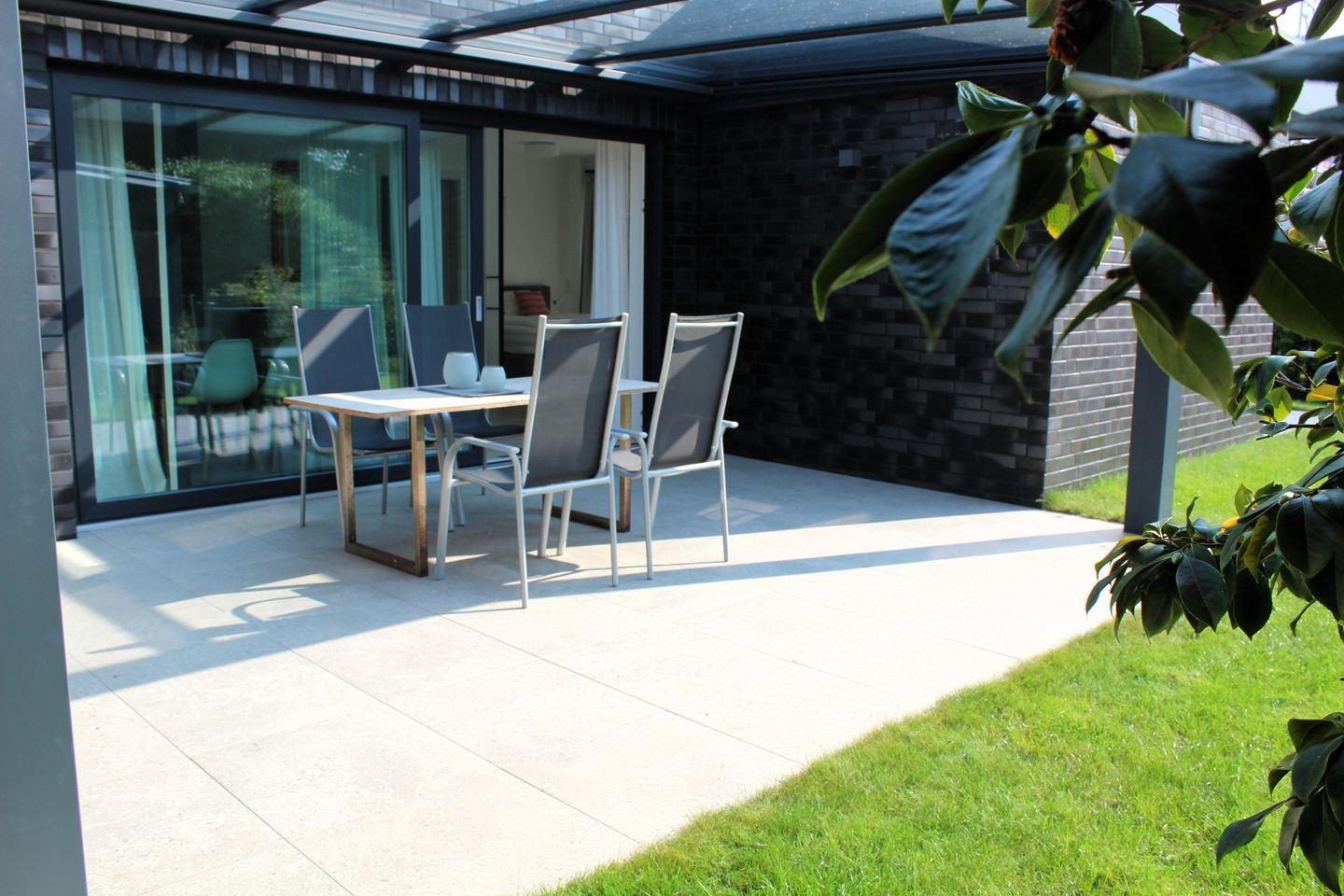 Der großzügige Wohnbereich mit offener Küche und bodentiefen Fenstern öffnet sich zu einer weiteren, großen Terrasse mit elektrischer Markise – ideal für entspannte Stunden im Freien.