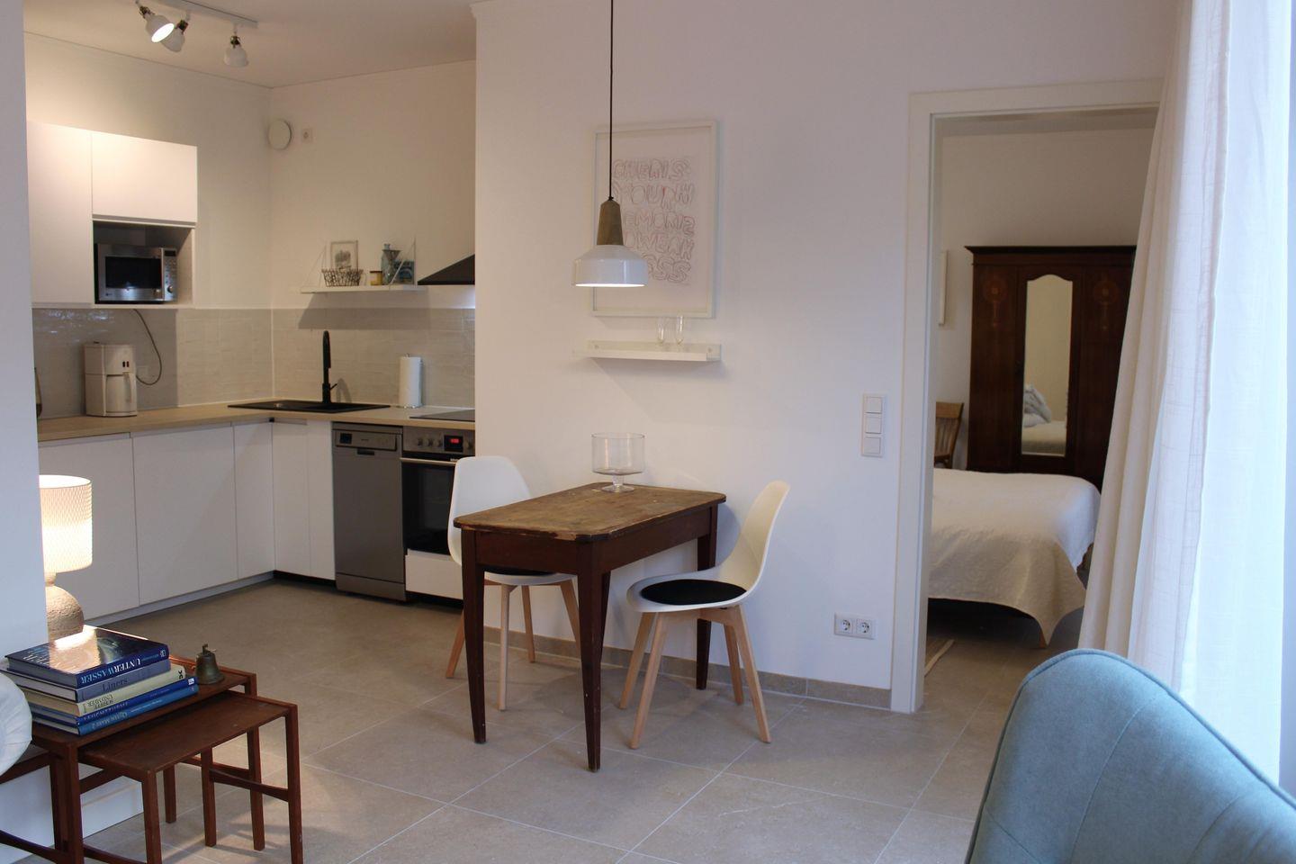 Diese liebevoll eingerichtete Wohnung bietet einen offenen Wohnbereich, ein Schlafzimmer mit Boxspringbett und ein modernes Bad. Die bodentiefen Fenster sorgen für viel Licht. Die Küche ist voll ausgestattet, inklusive Kaffeemaschine und Spülmaschine. Zur Entspannung gibt es eine Sauna im Garten. Zudem bieten wir WLAN, SAT-TV, eine E-Auto-Ladestation und Fahrradunterstellmöglichkeiten – alles für einen rundum entspannten Aufenthalt.