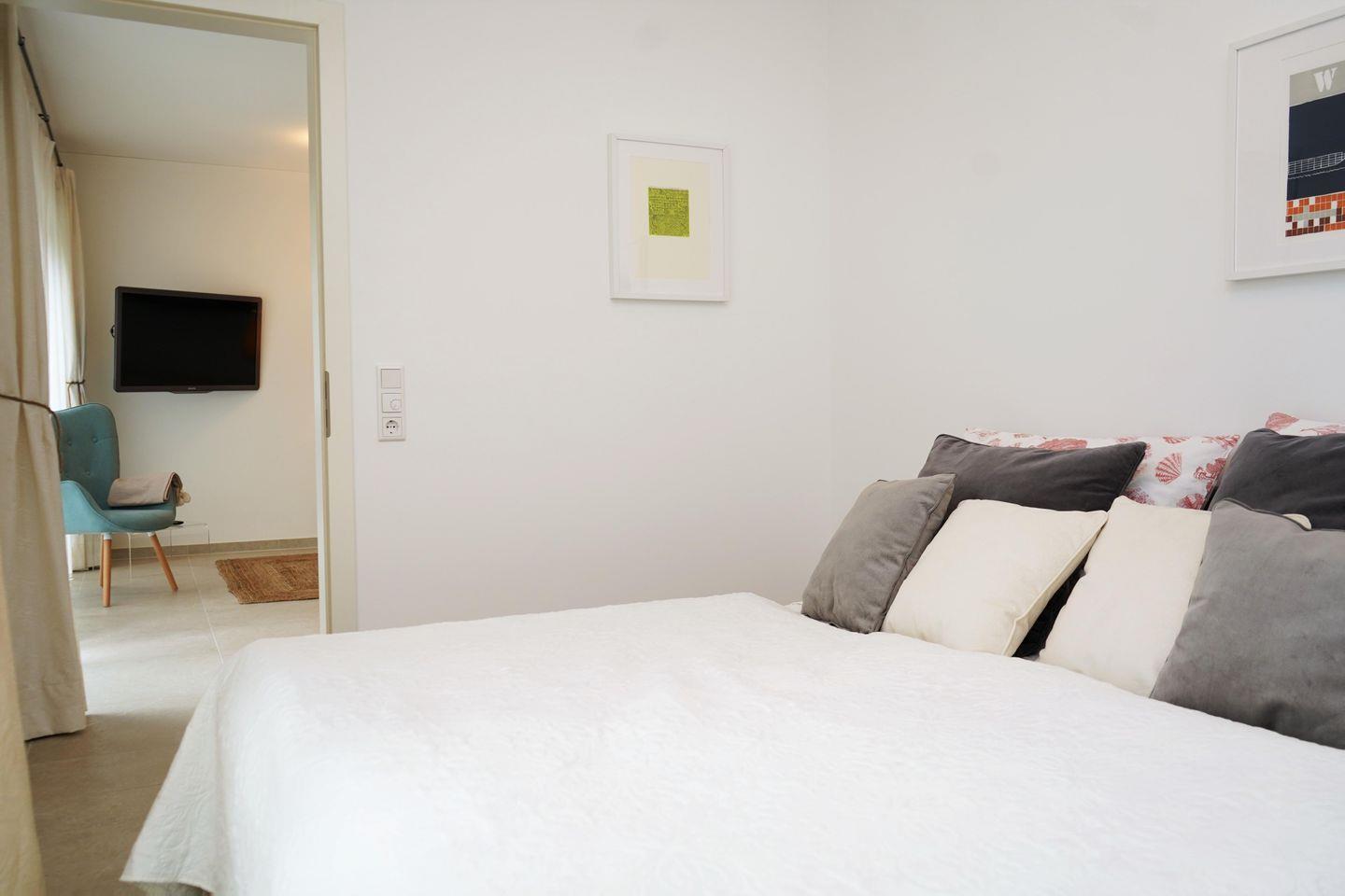 Im Schlafzimmer erwartet dich ein komfortables Boxspring-Doppelbett, in dem du jede Nacht entspannt schlafen wirst. Das moderne Badezimmer ist mit einer ebenerdigen Dusche und einem WC ausgestattet und verfügt außerdem über einen Haartrockner.