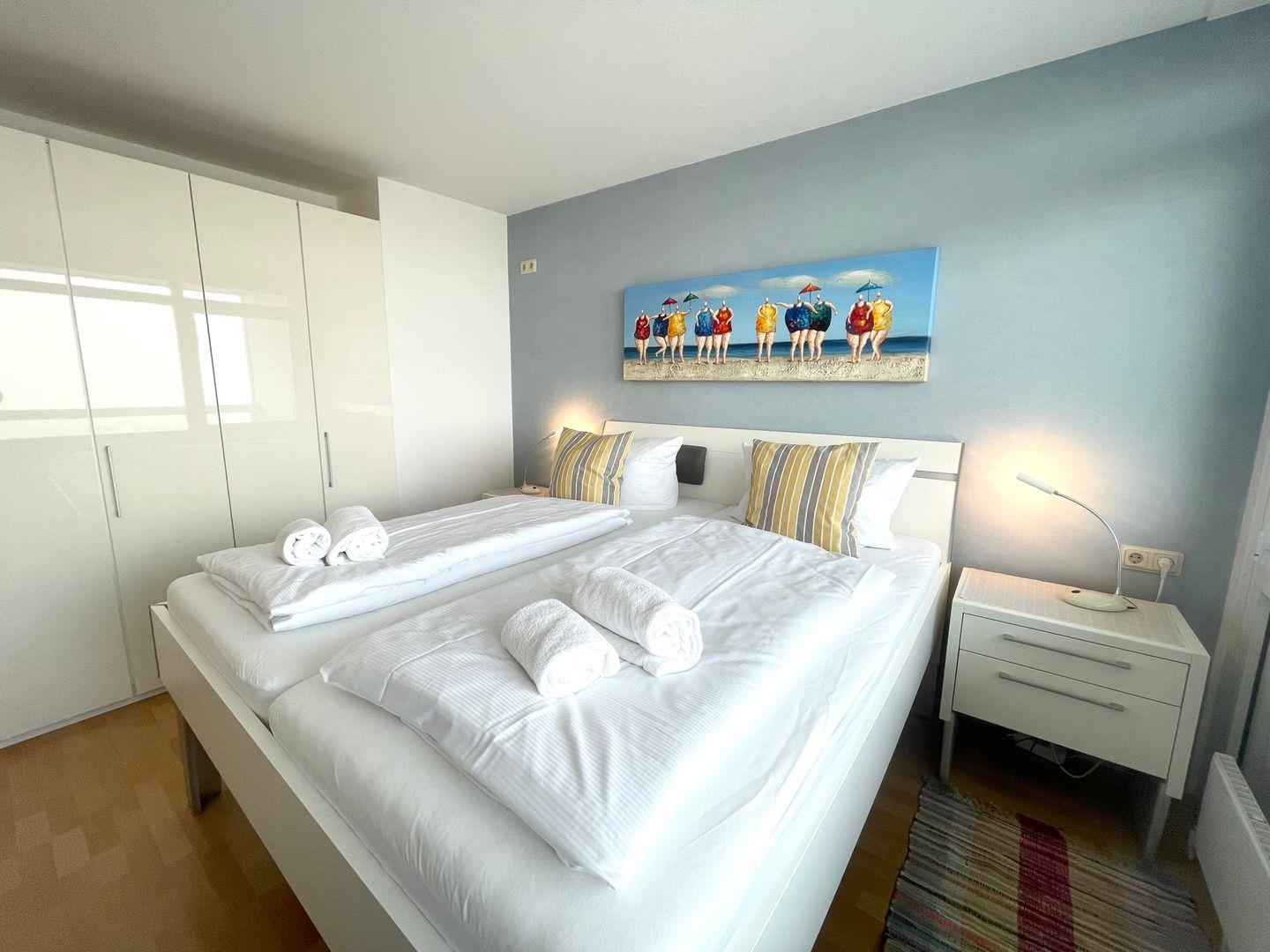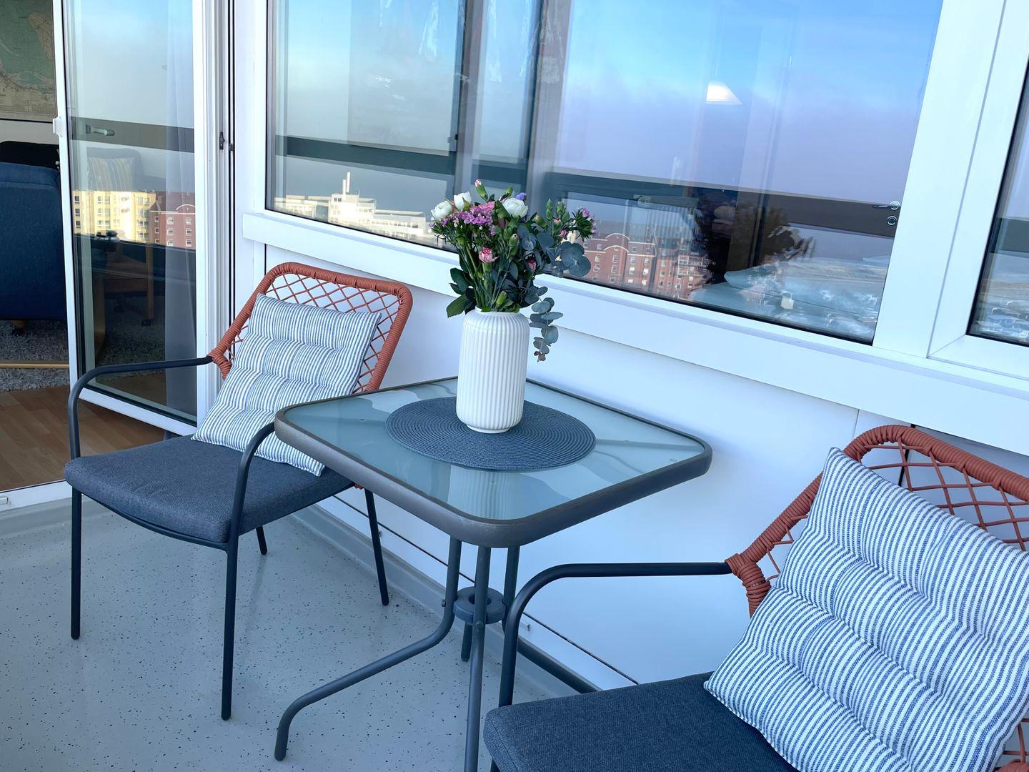 Die Ferienwohnung bietet Platz für bis zu zwei Personen. Sie verfügt über ein Schlafzimmer mit direktem Meerblick aus dem Bett und ein Badezimmer mit Dusche. Bereiten Sie in der offenen Küche Ihre Lieblingsgerichte zu und genießen Sie diese am Esstisch oder auf dem überdachten Balkon, während Sie den frischen Nordseewind und den Blick auf das Meer genießen.