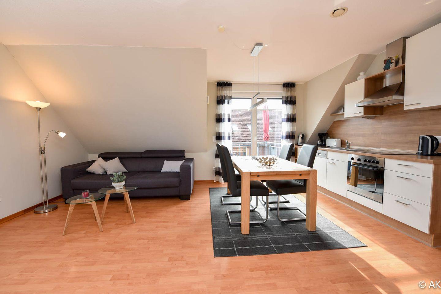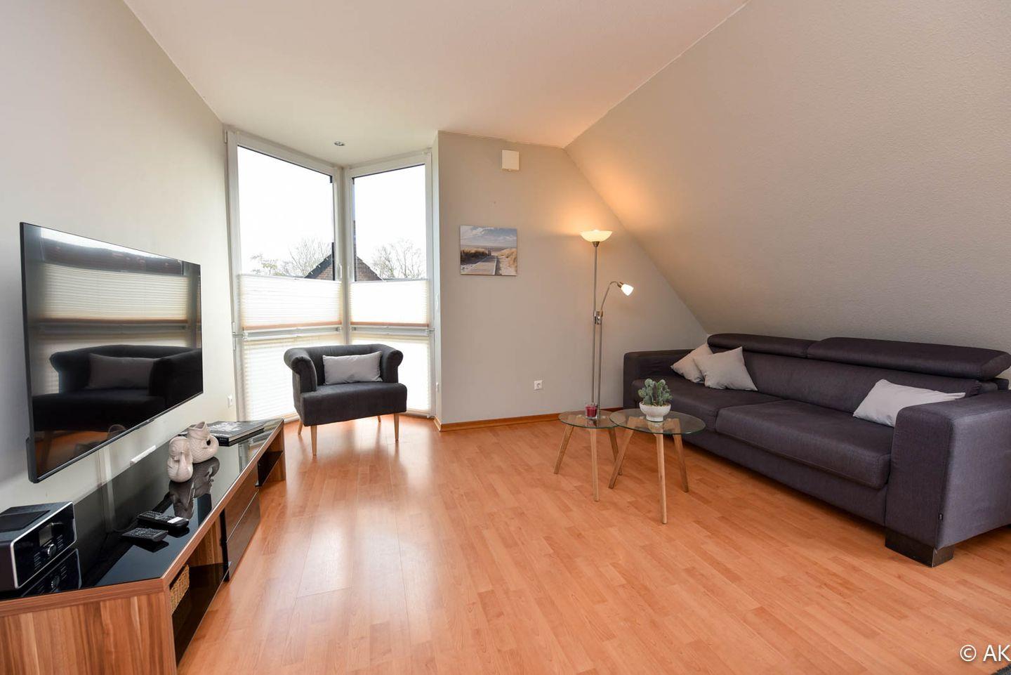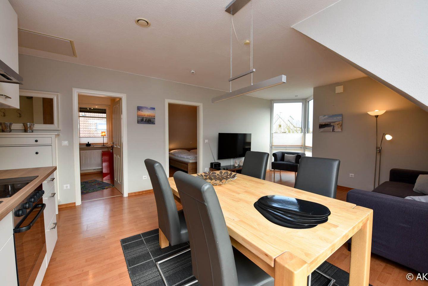 Die hochwertig ausgestattete Wohnung bietet zwei komfortable Schlafzimmer: eines mit einem bequemen Doppelbett, das andere mit einem 90 x 200 cm Einzelbett – ideal für Paare, Familien oder Alleinreisende. Die moderne Wohn-Küche lädt zum gemeinsamen Kochen und Verweilen ein, während das stilvolle Bad für zusätzlichen Komfort sorgt. Dank Fußbodenheizung genießen Sie auch an kühleren Tagen eine wohlige Wärme. Ein besonderes Highlight ist der sonnige Süd/West-Balkon, auf dem Sie die frische Nordseeluft in vollen Zügen genießen können.