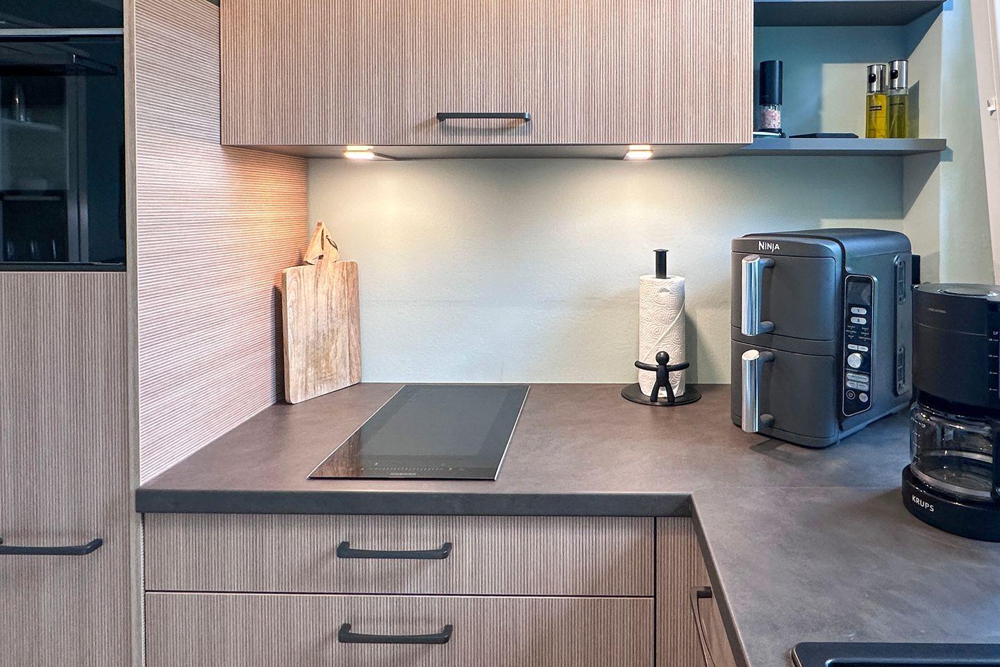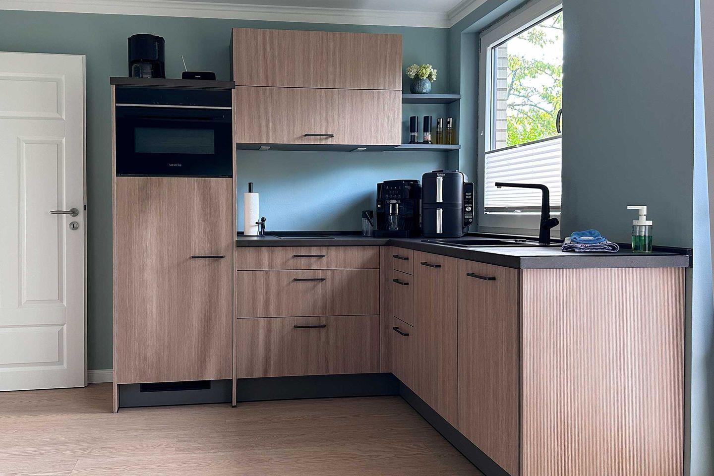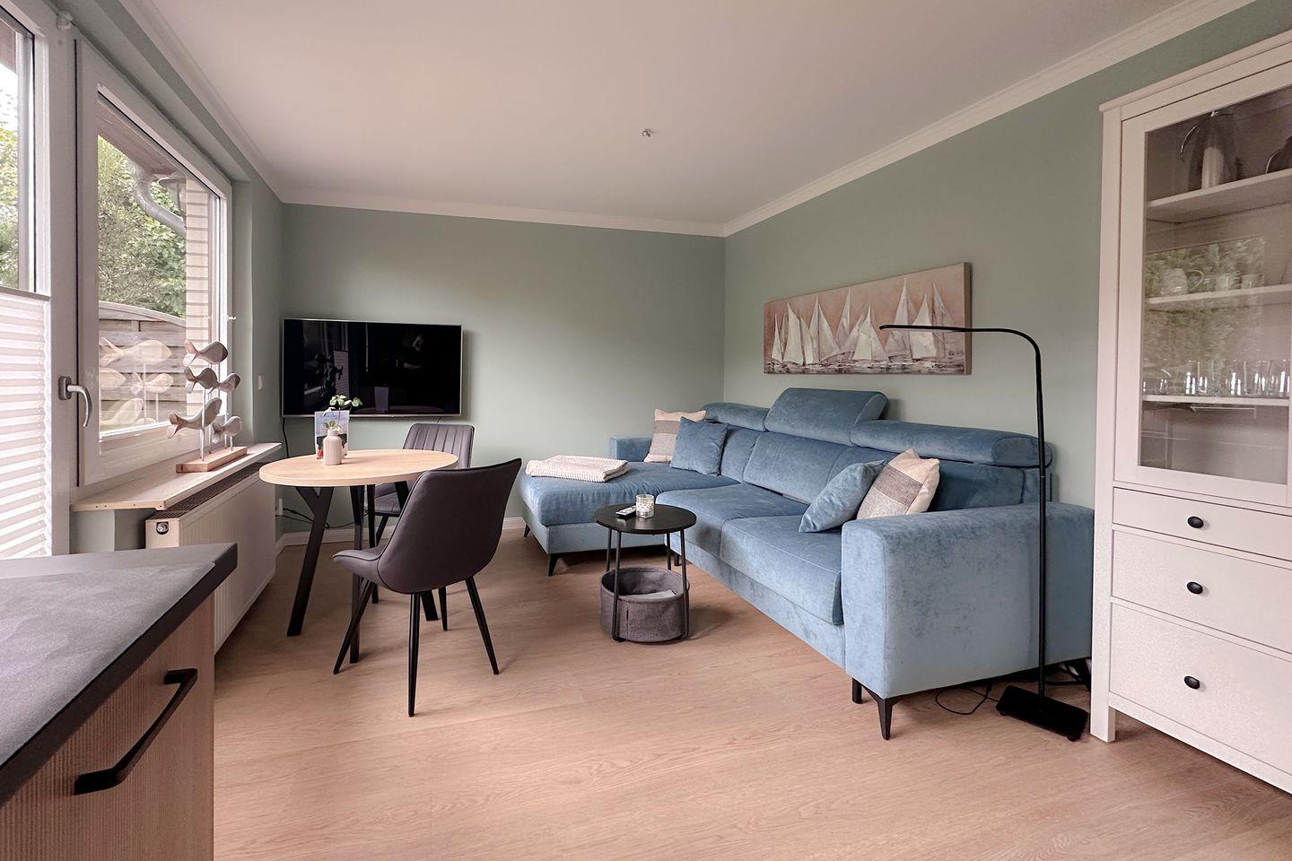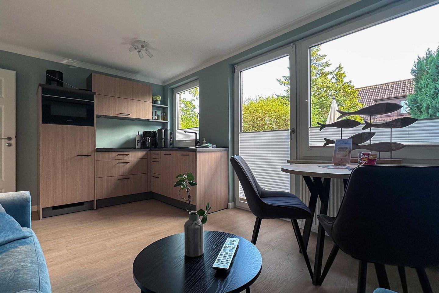 Mit einer Größe von ca. 40 m² bietet die Ferienwohnung Platz für bis zu zwei Personen und ist ideal für Paare. Sie verfügt über ein Schlafzimmer, ein modernes Badezimmer und ein einladendes Wohnzimmer, das mit einem komfortablen Sofa und einem Essbereich ausgestattet ist. Die offene Küche, die nahtlos in das Wohnzimmer integriert ist, ist mit hochwertigen Geräten ausgestattet, darunter ein Induktionskochfeld, ein Kühlschrank mit Gefrierfach, eine Spülmaschine und ein Kompaktbackofen mit Mikrowelle sowie ein Kaffeevollautomat und eine Ninja Doppel-Heißluftfritteuse, so dass Sie auch im Urlaub das Kochen genießen können. Auch das Wäschepaket ist bei dieser Ferienwohnung bereits inklusive.