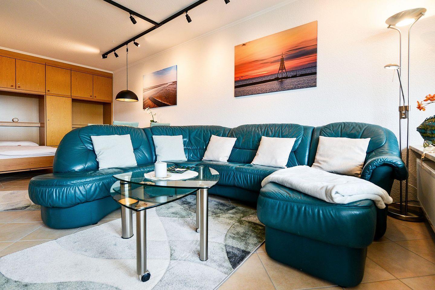 Ferienwohnung in Cuxhaven-Sahlenburg mit Meerblick: Gemütliche Nichtraucher-Unterkunft für 2–4 Personen mit Balkon, Schlafzimmer, Doppelschrankbett, Bad mit Wanne/Dusche. Haustiere erlaubt. Schwimmbad, Sauna, Ruheraum im Haus. Ruhige Lage nahe dem Strand. Kostenfreier PKW-Stellplatz am Haus. Ideal für Paare & Familien.