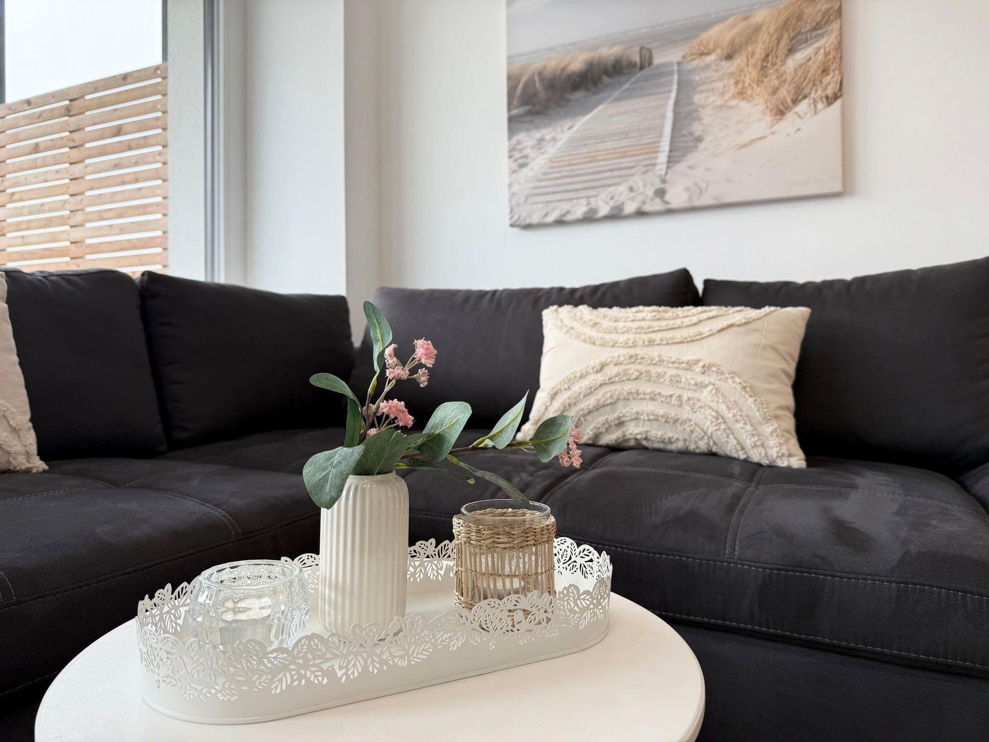 Der Wohnbereich lädt zum Verweilen ein. Hier finden Sie eine bequeme Sofaecke und einen großen Esstisch, der ideal für gemeinsames Essen oder Spieleabende ist. Ein Fernseher sorgt für entspannte Abende, und die integrierte Küche ist mit sämtlichen notwendigen Geräten wie Herd, Kühlschrank, Mikrowelle, Wasserkocher, Toaster und einer Kaffeemaschine ausgestattet.