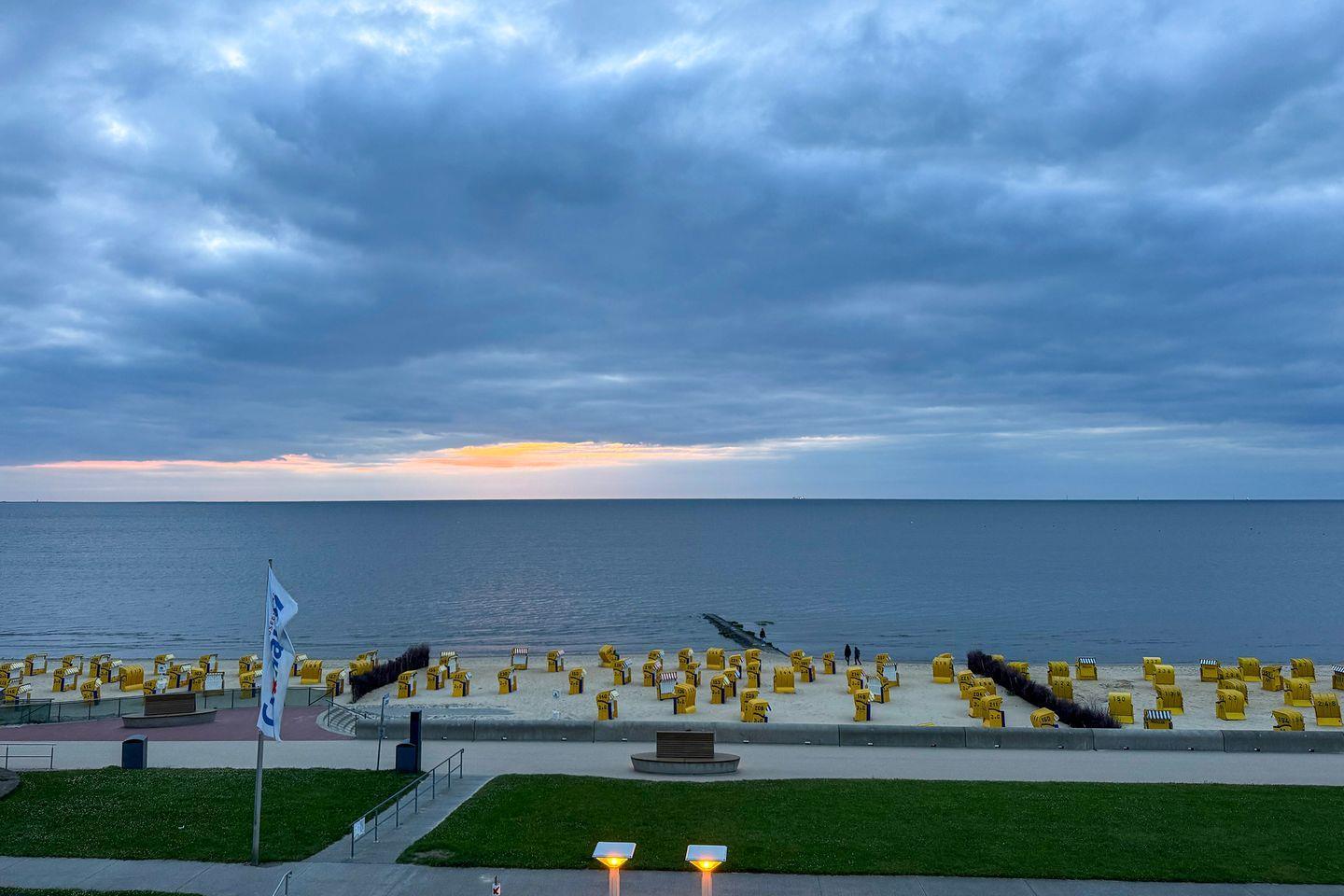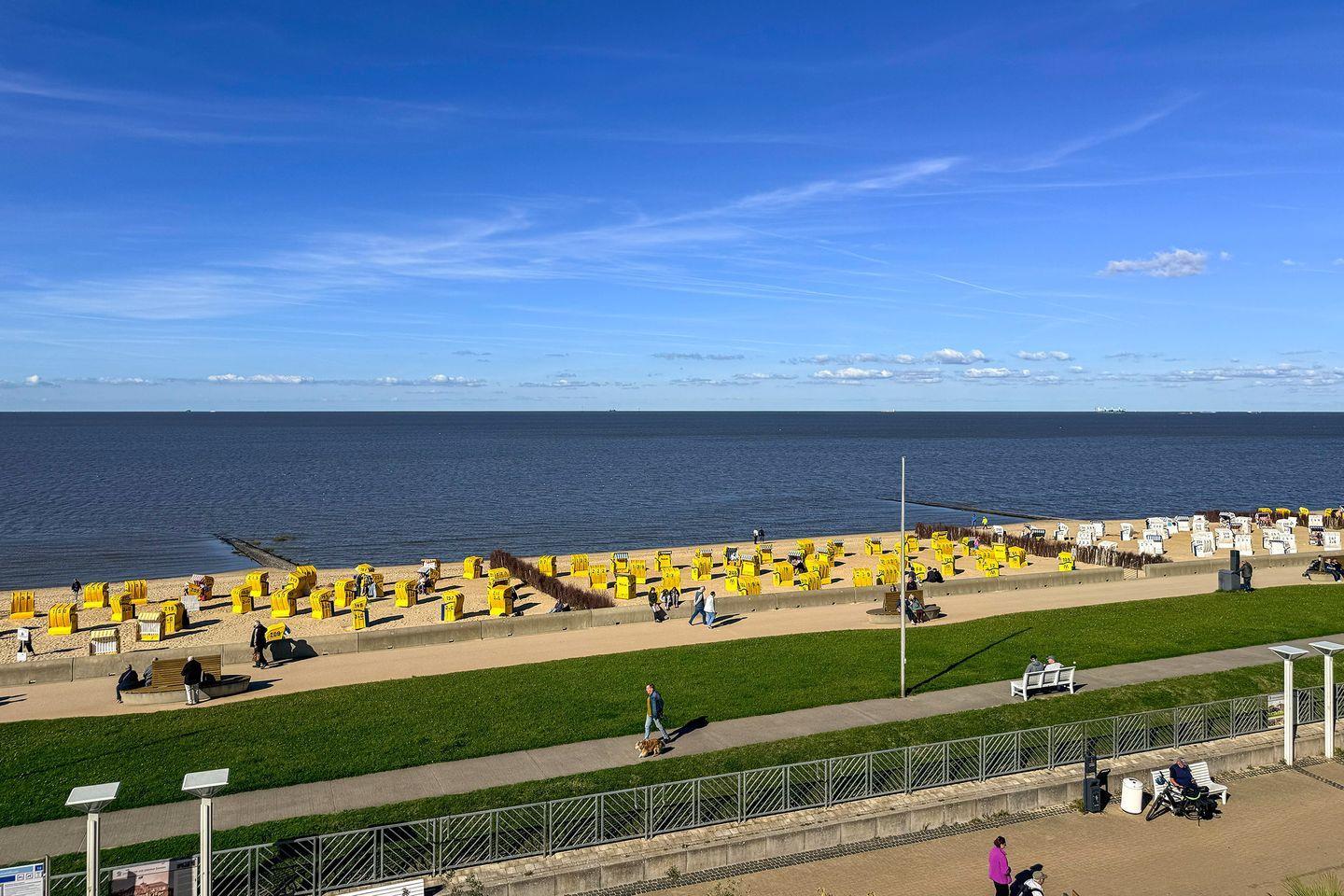Ferienwohnung 35 in Cuxhaven bietet Balkon mit Panorama-Meerblick, WLAN, Sauna und beheizten Pool direkt am Sandstrand.