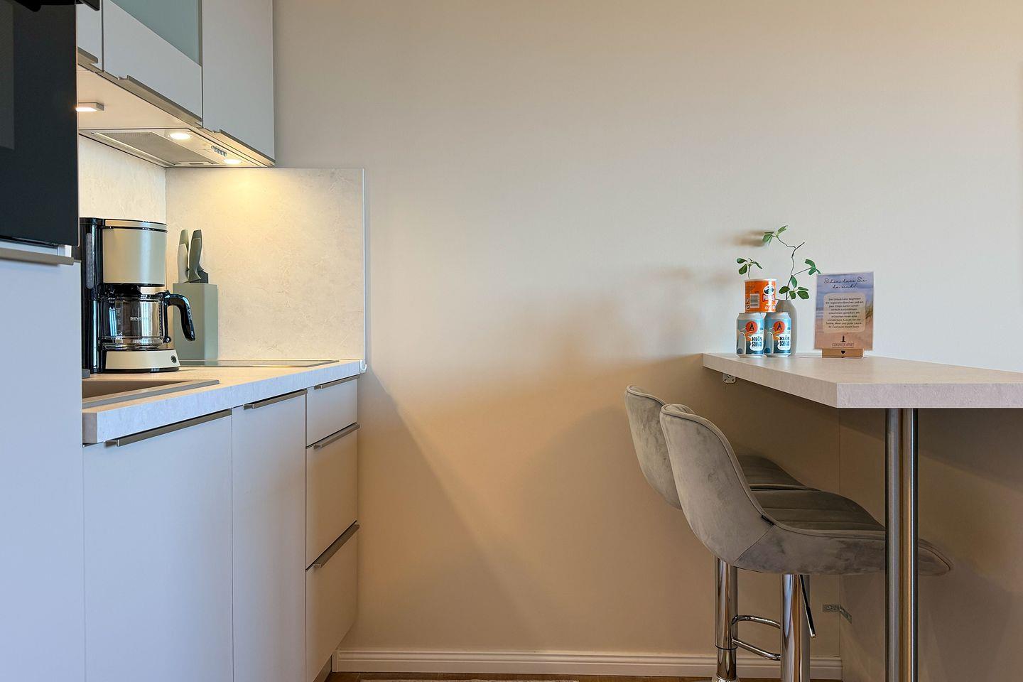 Mit einer Größe von ca. 35 m² verfügt die Wohnung über insgesamt zwei Zimmer, die Platz für bis zu zwei Personen bieten. Das Wohn- Schlafzimmer ist mit einem modernen Bodenbelag aus Vinyl ausgestattet und lässt durch große Fenster viel Tageslicht herein. Hier befindet sich auch das große Doppelbett. Der offene Küchenbereich ist ideal für Selbstversorger und lädt dazu ein, kulinarische Köstlichkeiten zubereiten. Die Küche ist mit hochwertigen Geräten ausgestattet, darunter ein Ceran-Herd, ein kombiniertes Backofen-Mikrowellen-Gerät, ein Kühlschrank mit Gefrierfach sowie eine Spülmaschine. Zudem stehen Ihnen Geschirr, Besteck und zahlreiche Küchenutensilien zur Verfügung. Für den perfekten Start in den Tag sorgt die Kaffeemaschine, während der Wasserkocher und der Toaster schnelle Snacks ermöglichen.