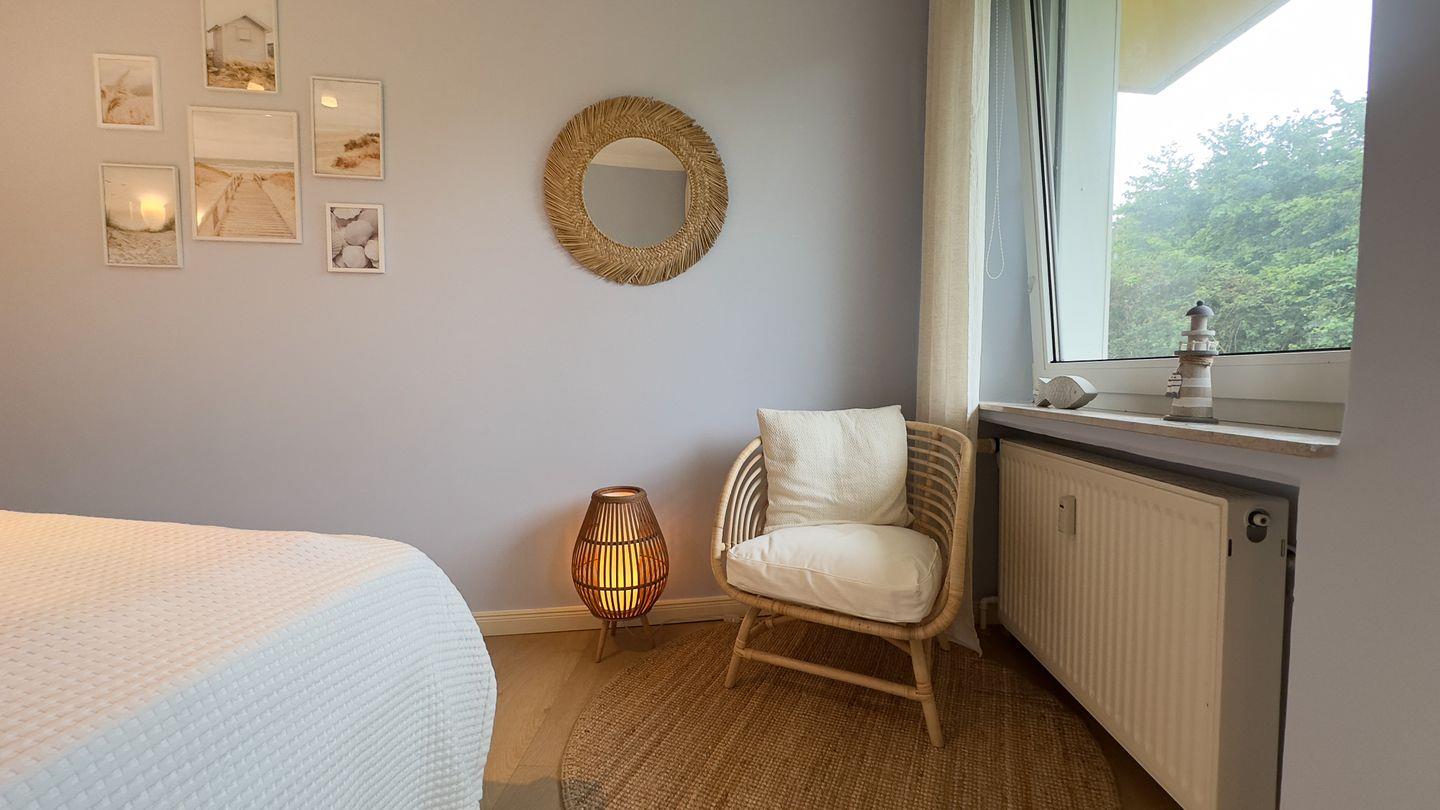 • Separates Schlafzimmer mit bequemem Bett und Lesesessel