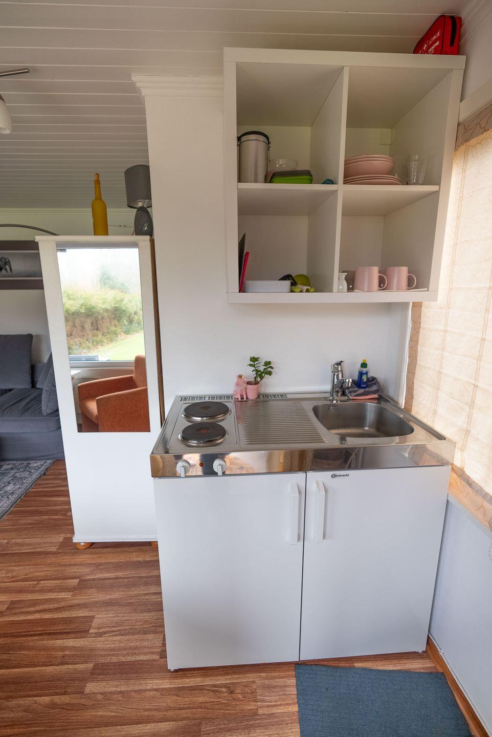 Mit einer Wohnfläche von ca. 18 m² ist die Datscha klein, aber fein – perfekt für alle, die ein bisschen Abstand vom Alltag suchen und Wert auf Privatsphäre legen. Der Wohnraum ist funktional und liebevoll eingerichtet und bietet alles, was man für eine erholsame Zeit braucht: eine praktische Kochnische mit 2-Platten-Herd, Kühlschrank und Kaffeemaschine sowie einen Essbereich für gemütliche Mahlzeiten.