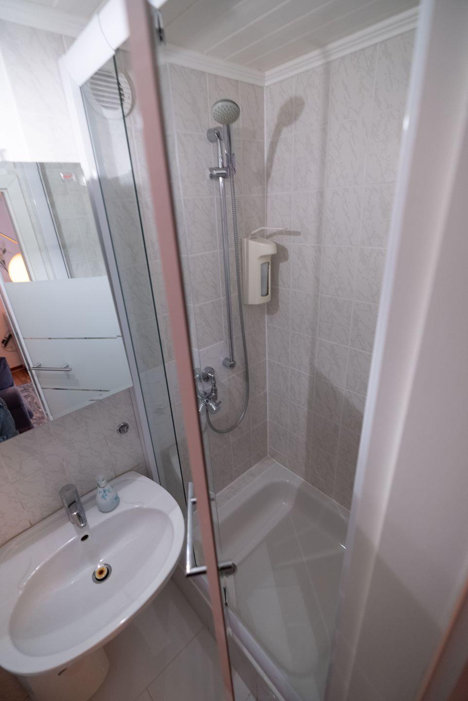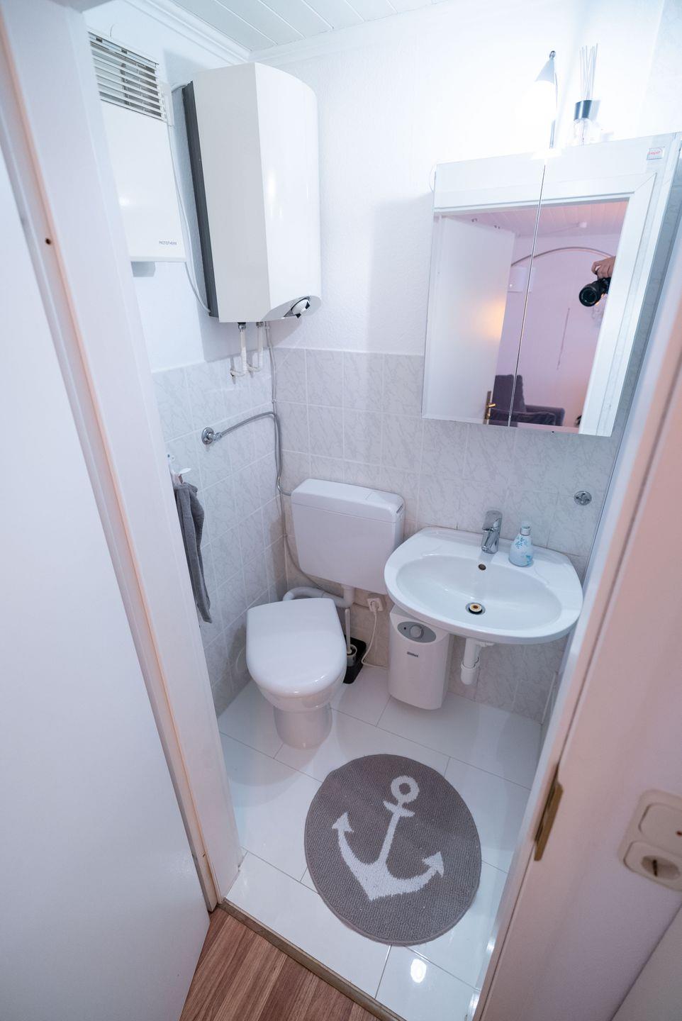 Das Badezimmer ist kompakt und verfügt über eine Dusche, WC, Waschbecken und Spiegel – einfach, aber zweckmäßig.