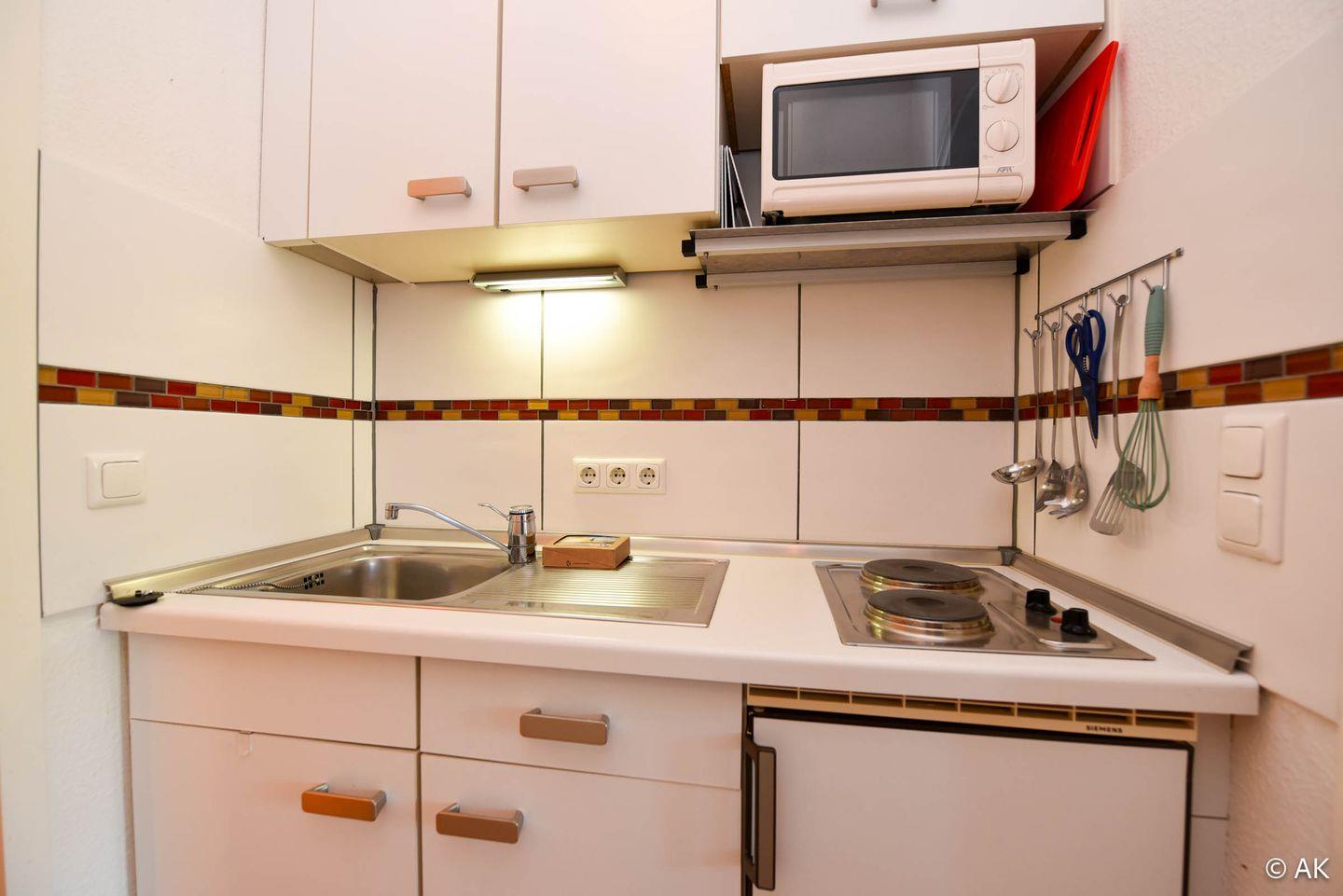 Die Ferienwohnung ist für bis zu 2 Personen ausgestattet und verfügt über ein komfortables Schrankbett sowie ein Sofa mit passendem Tisch. In der separaten Kochnische lassen sich problemlos kleine Mahlzeiten zubereiten. Das moderne Duschbad ist mit WC ausgestattet.