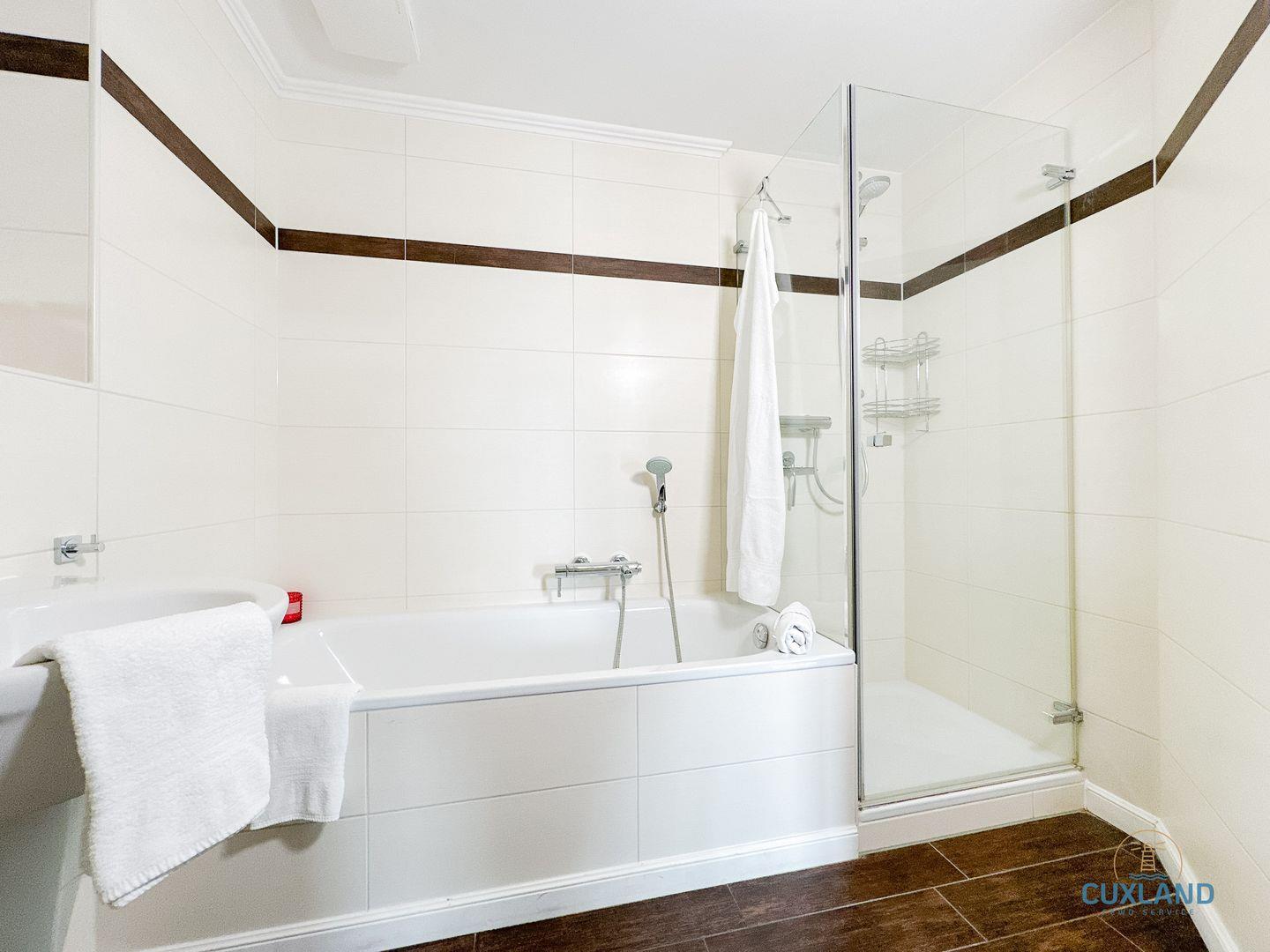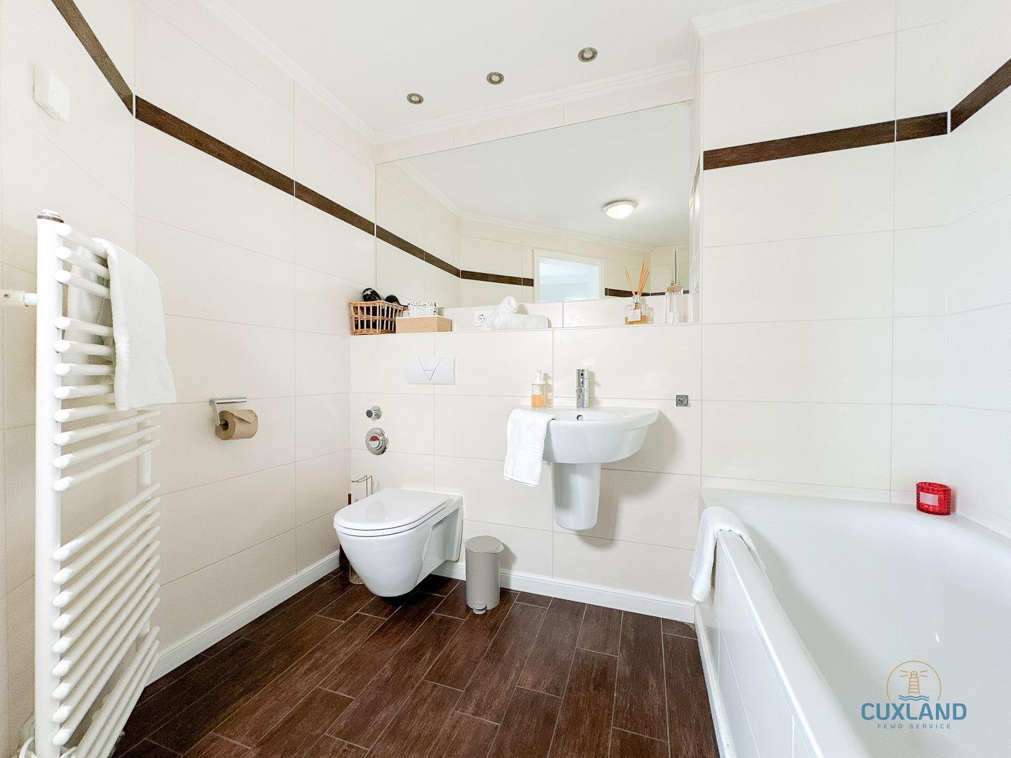 - Großzügiges Bad mit Dusche, Badewanne, WC, Waschbecken, Spiegel & Haartrockner