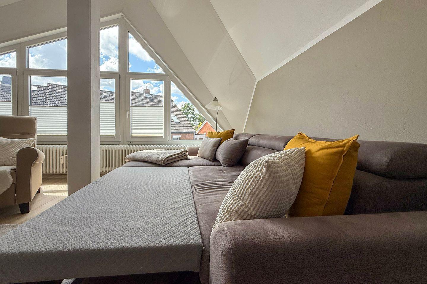 Die Wohnung eignet sich hervorragend für bis zu drei Personen und ist besonders familienfreundlich konzipiert: Neben dem separaten Schlafzimmer, das für erholsame Nächte sorgt, gibt es auf dem Schlafsofa im Wohnzimmer eine zusätzliche Schlafmöglichkeit. Dies bietet Flexibilität und Komfort für Familien mit Nachwuchs. Der offene Wohnbereich ist durch eine gemütliche Sofaecke ergänzt, die ideal zum Entspannen nach einem Tag am Meer oder bei Ausflügen ins Watt einlädt. Für gemeinsame Mahlzeiten steht Ihnen ein eigener Essbereich zur Verfügung.