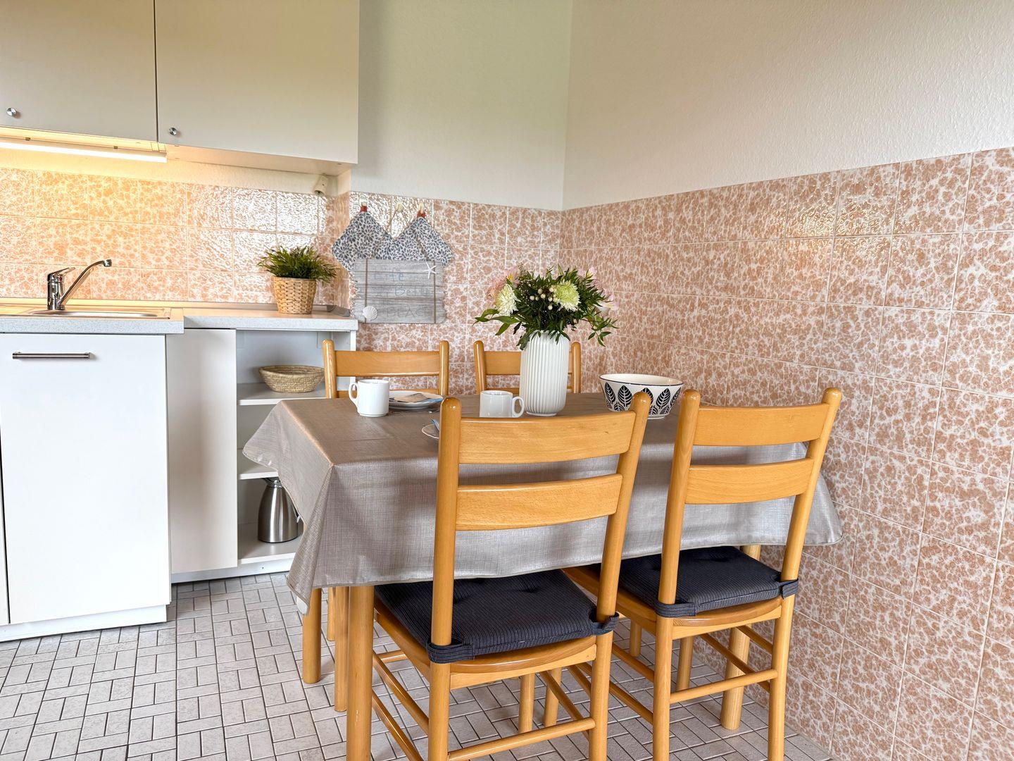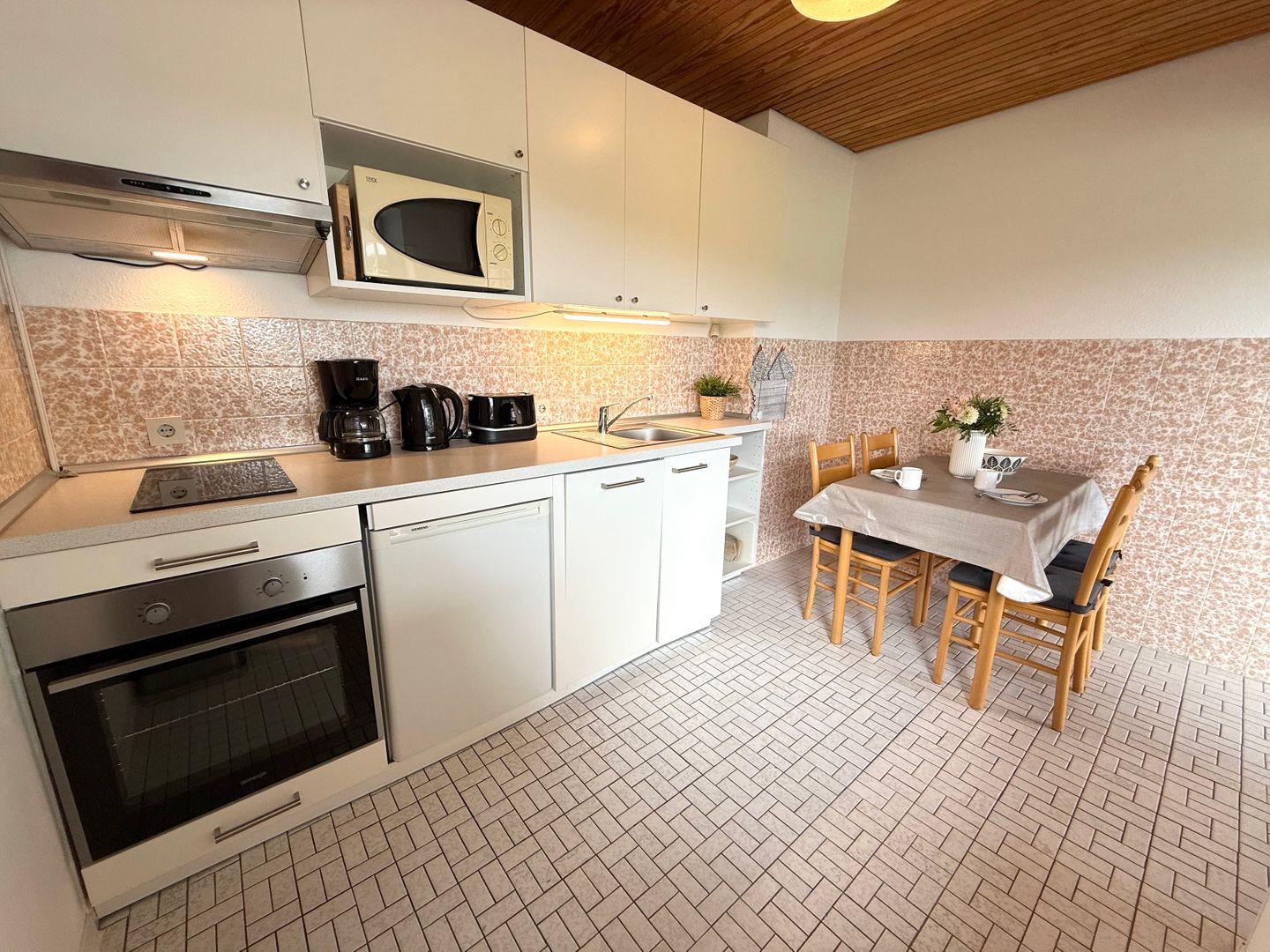 Die moderne Küchenzeile ist umfassend ausgestattet und verfügt über einen 2-Platten-Herd, einen Backofen, eine Spülmaschine, einen Kühlschrank, eine Mikrowelle, eine Kaffeemaschine, einen Toaster, Küchenutensilien sowie einen Wasserkocher. So sind Sie bestens für die Zubereitung Ihrer Lieblingsspeisen gerüstet.