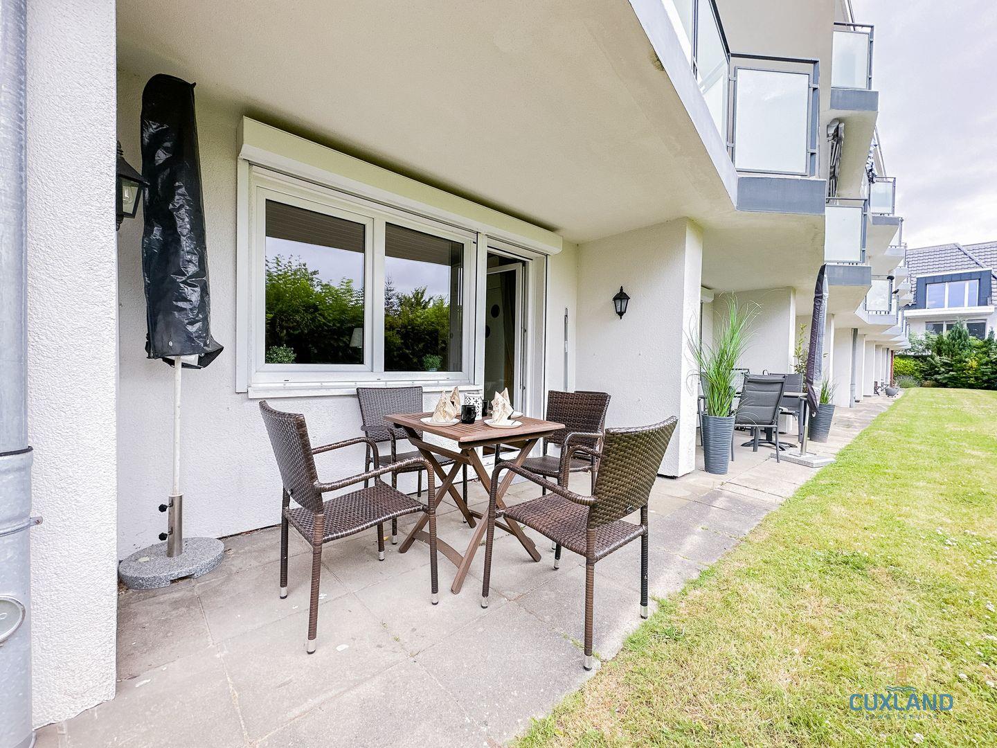 Strandnahe Ferienwohnung Kehrwieder Nr. 8 in Cuxhaven-Döse mit überdachter Terrasse und Gartenblick.