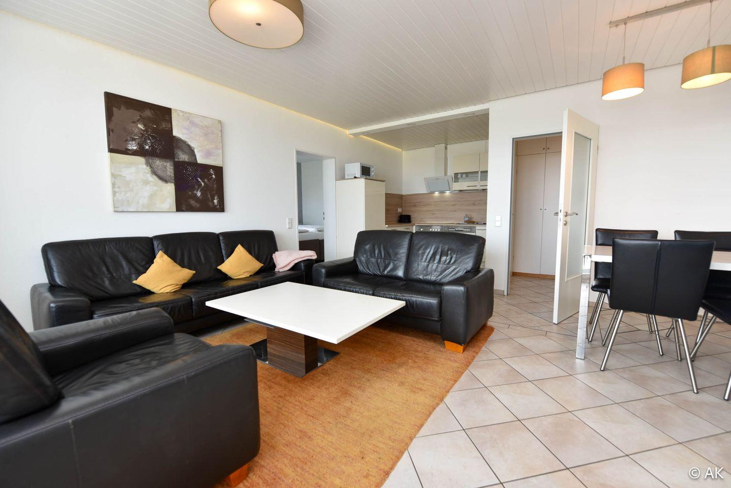 Die Wohnung ist aufgeteilt in einen offenen Wohn-, Ess- und Küchenbereich sowie zwei Schlafbereiche mit je einem Doppelbett. Der vordere Schlafbereich bietet besonders viel Platz und ist zusätzlich mit einer Couch und einem zweiten Fernseher ausgestattet – ideal für Paare oder Familien, die Wert auf Komfort und Rückzugsmöglichkeiten legen. Die moderne Einbauküche mit Geschirrspüler bietet viel Raum für gemeinsame Mahlzeiten. Das Bad ist mit Dusche und WC ausgestattet.