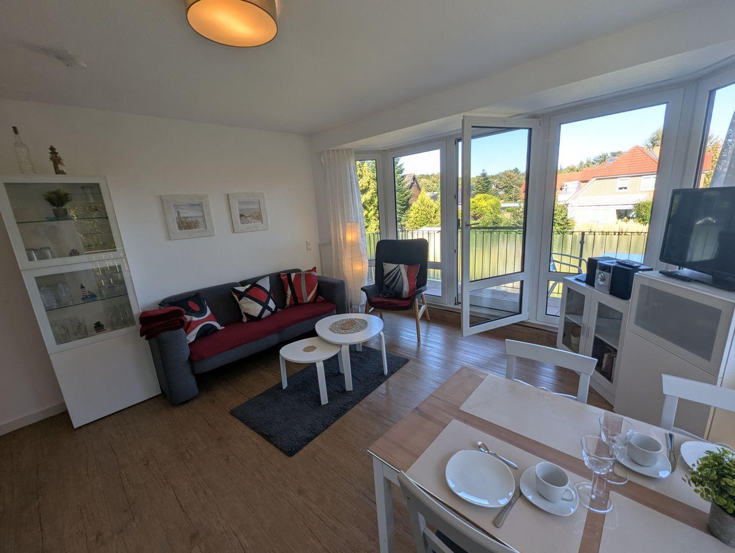 Das helle Wohnzimmer ist mit einem gemütlichen Sofa und einem Sessel ausgestattet. Für Unterhaltung sorgen ein TV und ein Radio. Über den Wohnbereich gelangen Sie direkt auf den überdachten Balkon, von dem aus Sie den Gartenblick genießen können – hier lässt es sich zu jeder Tageszeit entspannen, unabhängig vom Wetter.