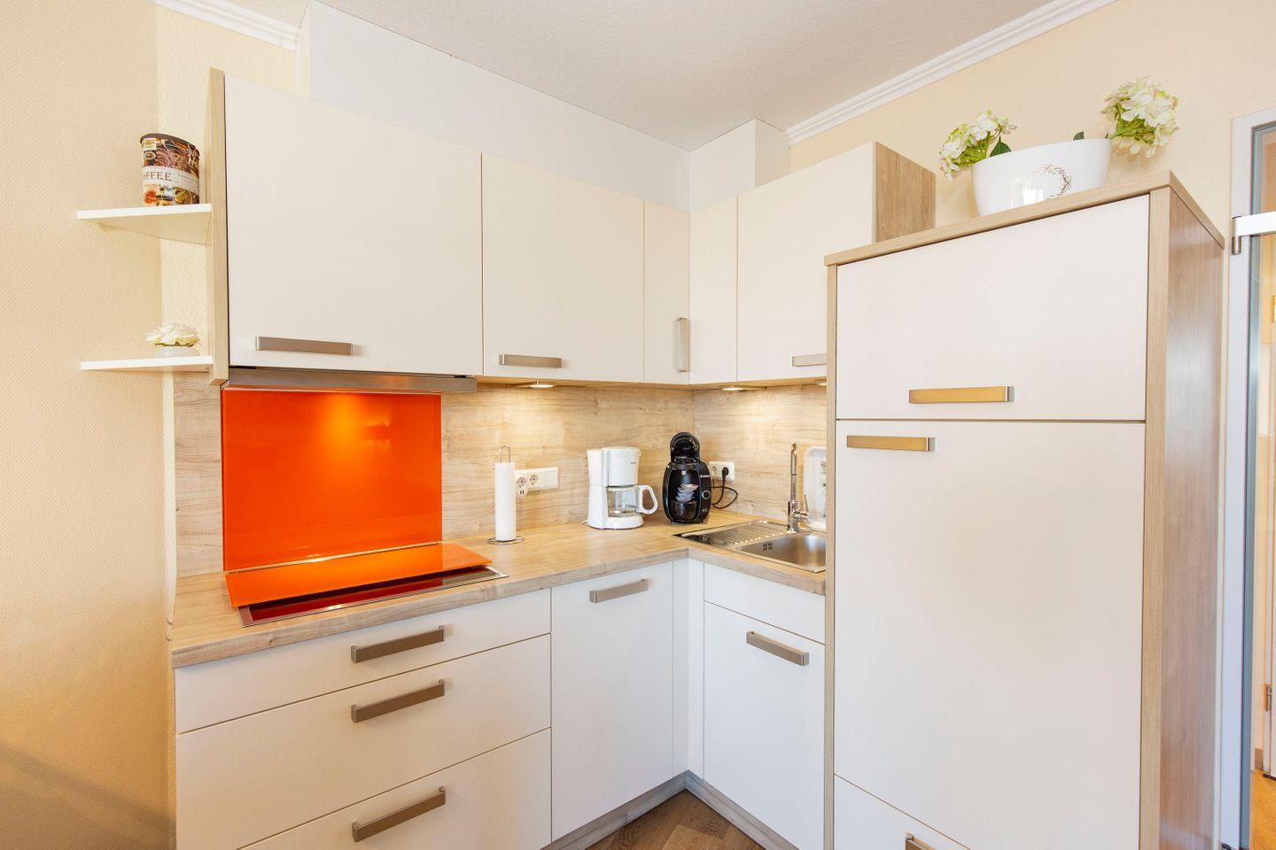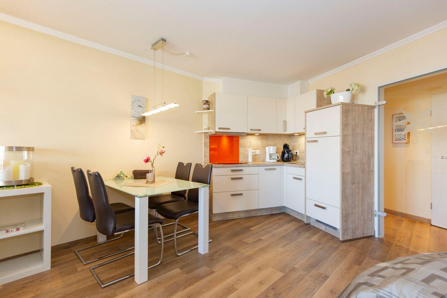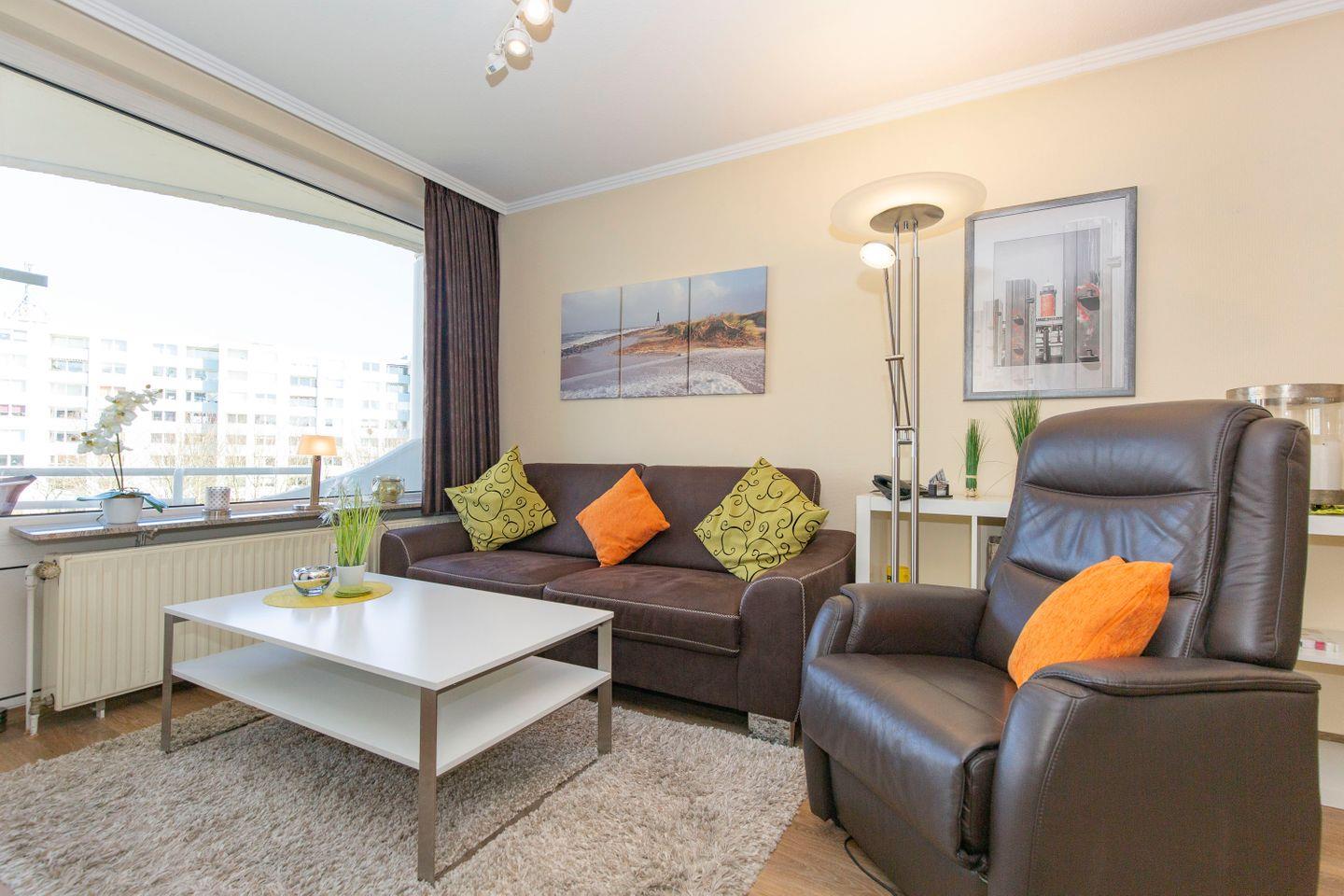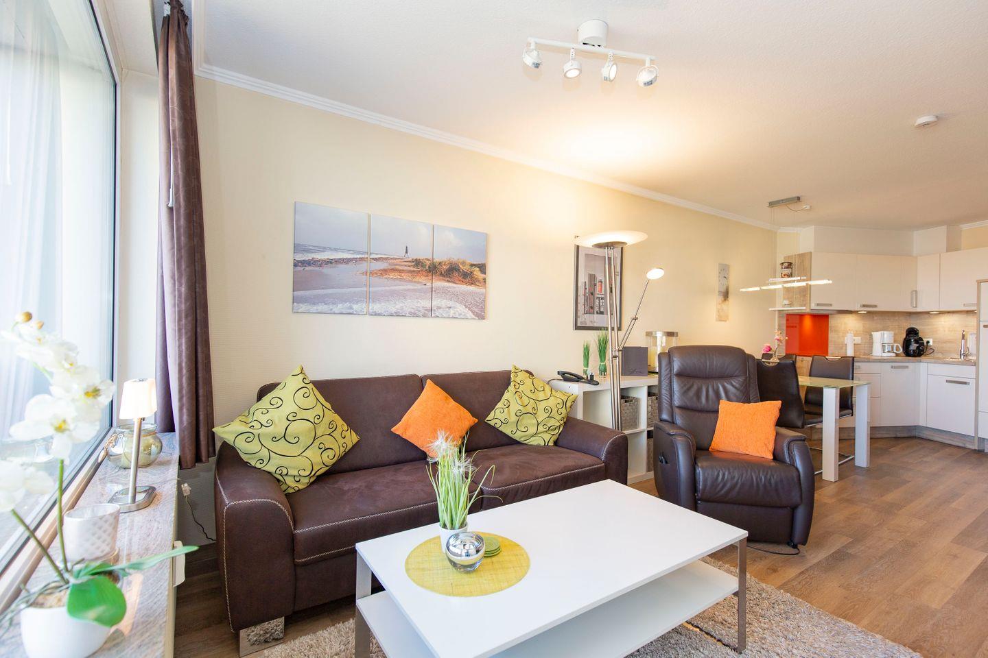 Haus "Lord Nelson", Typ 2, App.-Nr. 312, bis 3 Pers., ca 40 qm Größe, seitlicher Meerblick Richtung Elbe/Weltschifffahrtsweg, Wohnbereich mit Boxspringbett (160x200, einzelne Matratzen), Kinderzimmer mit Einzelbett, Dusche/WC, Küchenzeile mit Geschirrspüler, 4-Platten-Ceranfeld und Mikrowelle, Vinylboden, Balkon, Kabel-TV, kostenl. W-Lan Zugang im App., Tiefgaragenstellplatz, Strandkorb im Sommer 2026, Nichtraucherappartement, Haustiere sind nicht gestattet.