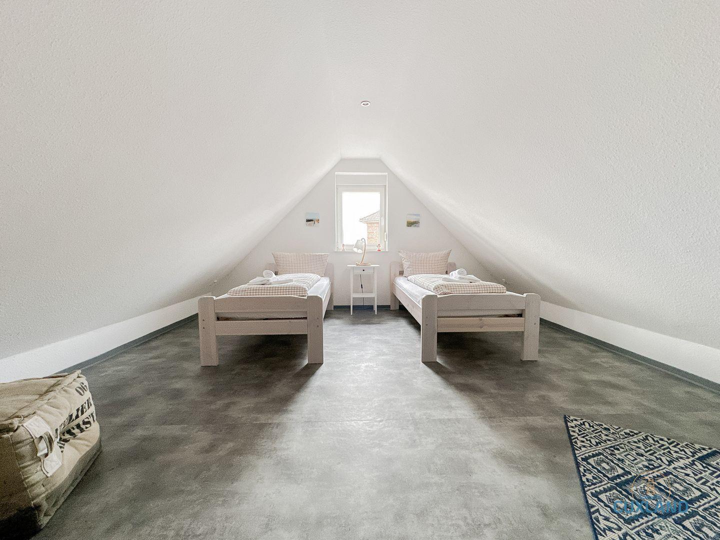 Die Wohnung verfügt über zwei separate Schlafzimmer. Eines davon mit Doppelbett (180x200cm). Ein weiteres auf der oberen Ebene über eine Treppe erreichbar mit zwei Einzellbetten. Die Zimmer bieten angenehmen Schlafkomfort und ausreichend Platz für Gepäck und persönliche Gegenstände.