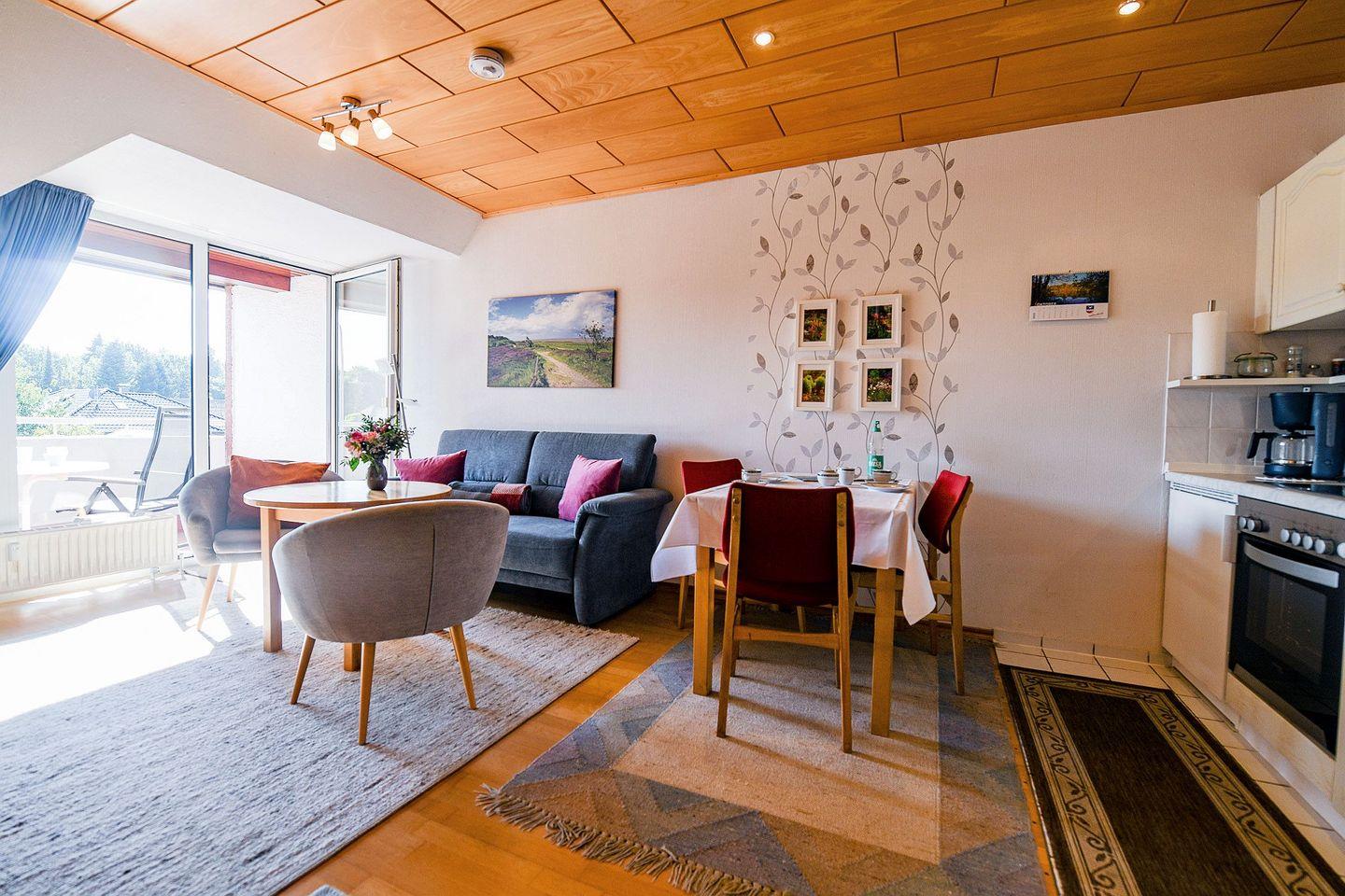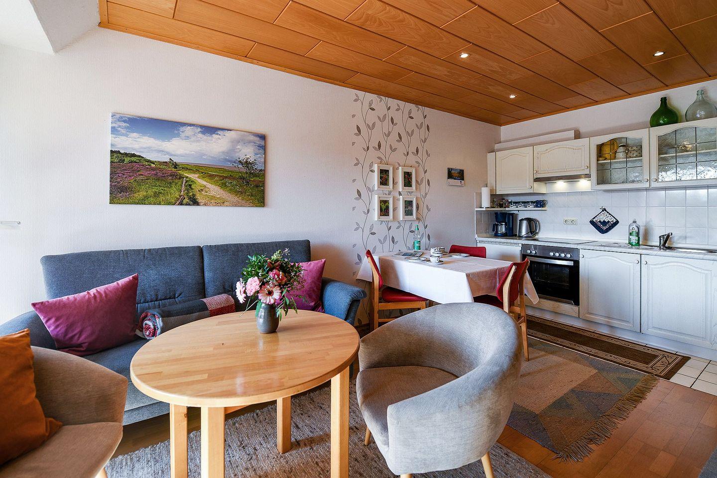 Die offene Küche ist direkt mit dem Wohnzimmer verbunden und schafft dadurch ein angenehmes Wohngefühl. Zur Küchenausstattung gehören ein moderner Ceranherd mit Elektrobackofen, Kühlschrank, Kaffeemaschine, Wasserkocher, Toaster sowie sämtliche Küchenutensilien, die für die Zubereitung von Mahlzeiten benötigt werden. Der angrenzende Essbereich mit Esstisch und Stühlen bietet ausreichend Platz für gemütliche Speisen im Kreis der Liebsten. Der Wohnbereich ist mit einem komfortablen Sofa und einem Sessel ausgestattet und lädt zum Ausruhen oder Fernsehen ein – ein moderner Flachbild-TV mit digitalem Kabelanschluss steht zur Verfügung.