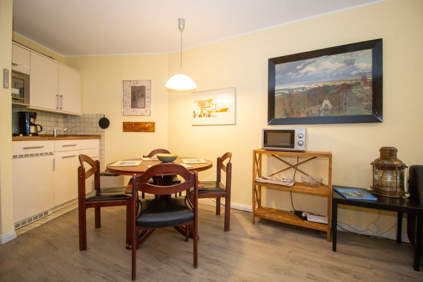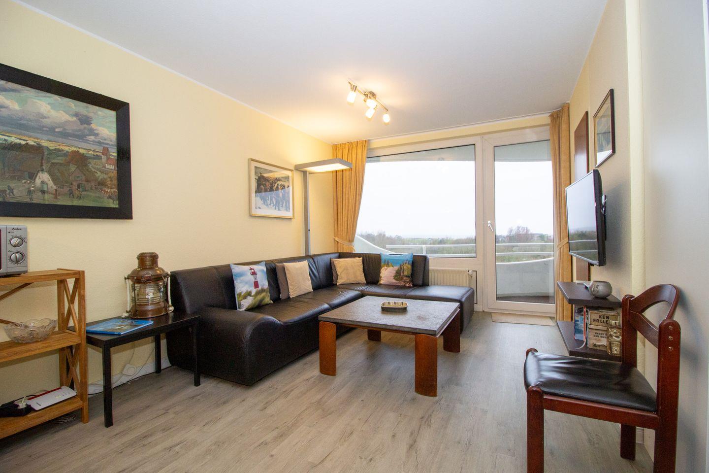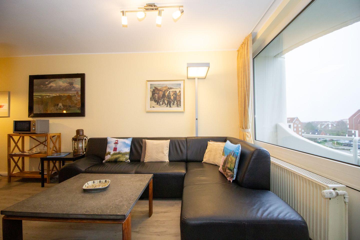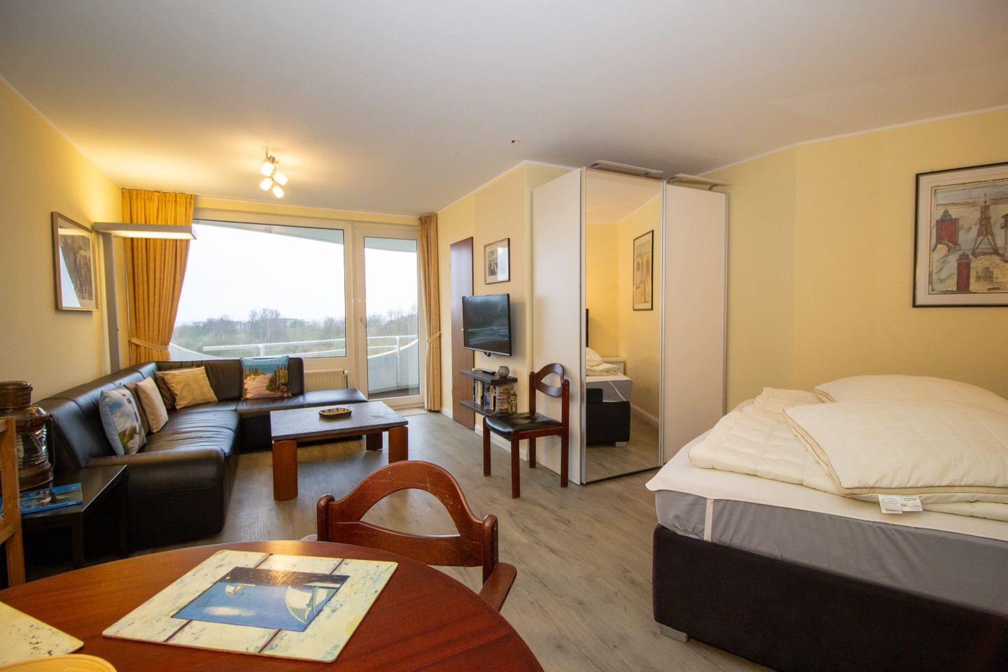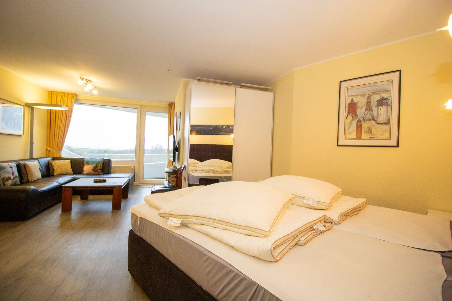 Haus "Lord Nelson", Typ 2, App.-Nr. 403, bis 3 Personen, 4. Etage, ca. 40 qm, Lage Richtung Weltnaturerbe Wattenmeer, Meerblick Richtung Neuwerk, Wohn/Schlafbereich mit feststehendem Doppelbett (2 einzelne Matratzen), sep. Schlafzimmer mit Einzelbett, Dusche/WC, Küchenzeile mit Mikrowelle und Geschirrspüler, Balkon, kostenl. WLAN-Anschluss im App., Kabel-TV, Tiefgaragenstellplatz, Nichtraucherappartement, Haustiere sind nicht erlaubt, Strandkorb im Sommer 2026.