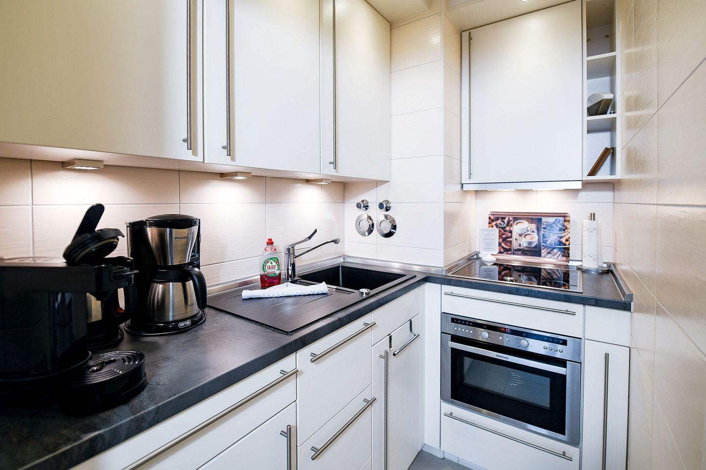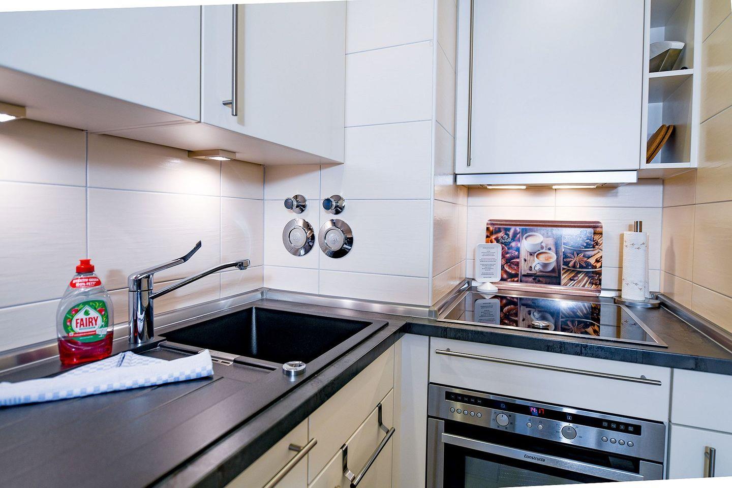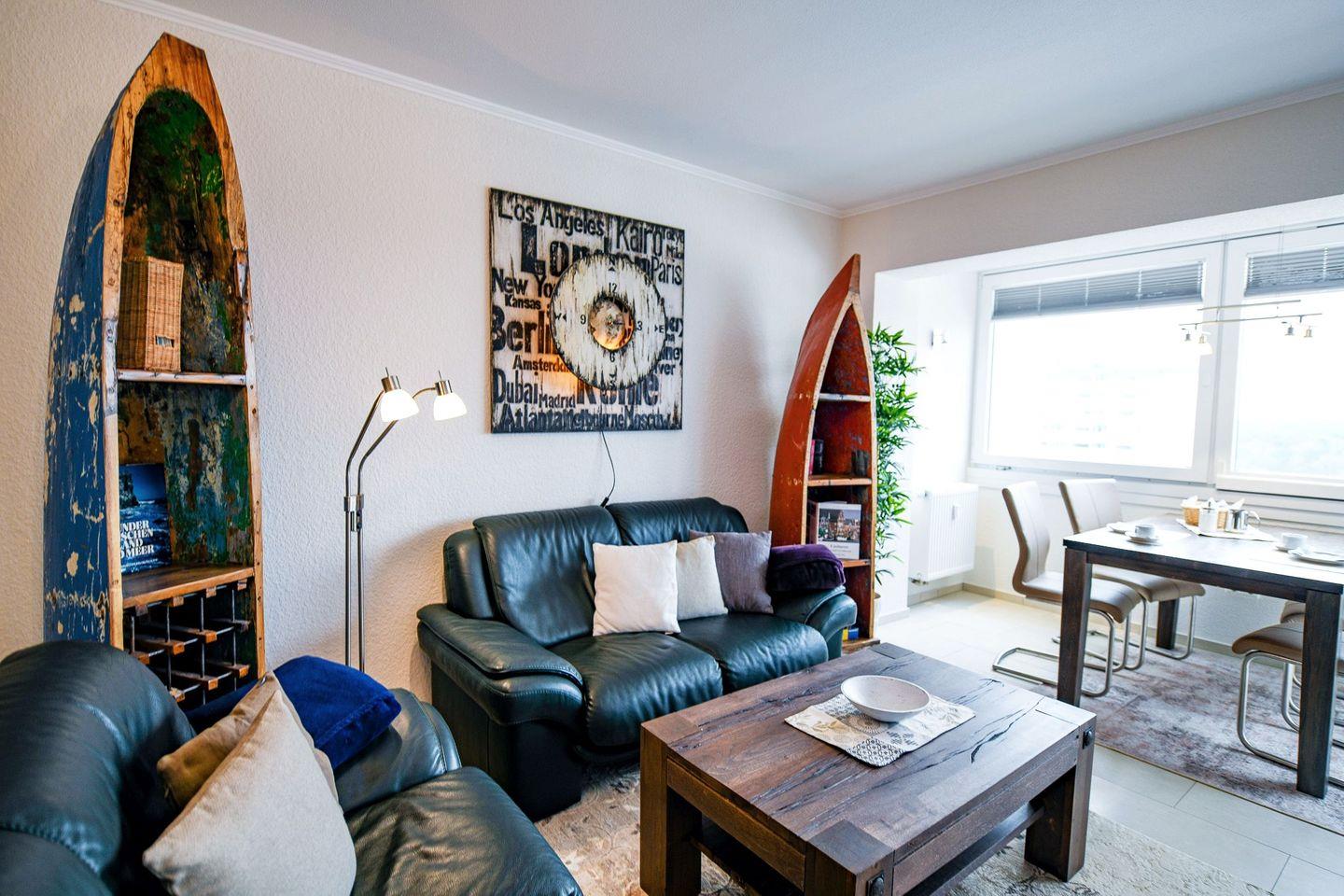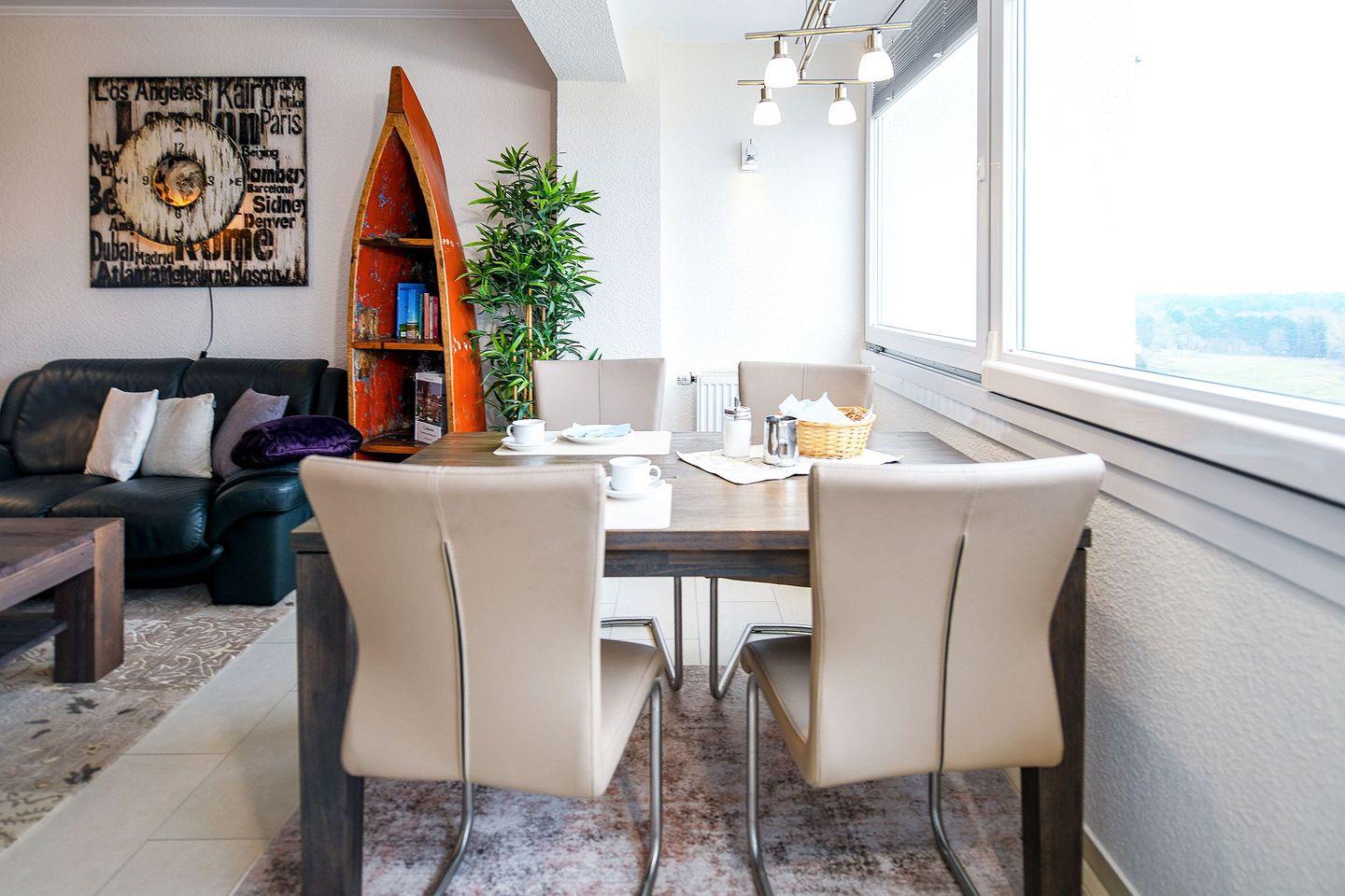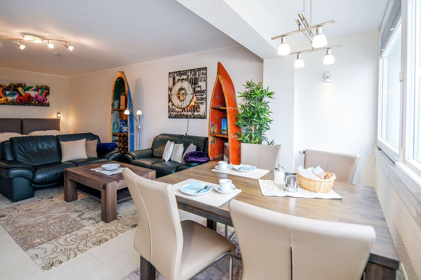 Die helle Ferienwohnung verfügt über eine moderne, offene Küche, einen gemütlichen Wohn- und Essbereich sowie eine große verglaste Südfensterfront zum Öffnen. Das neue Bad mit bodengleicher Flachdusche und Radio sorgt für zusätzlichen Komfort.