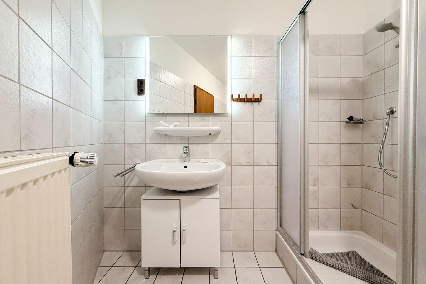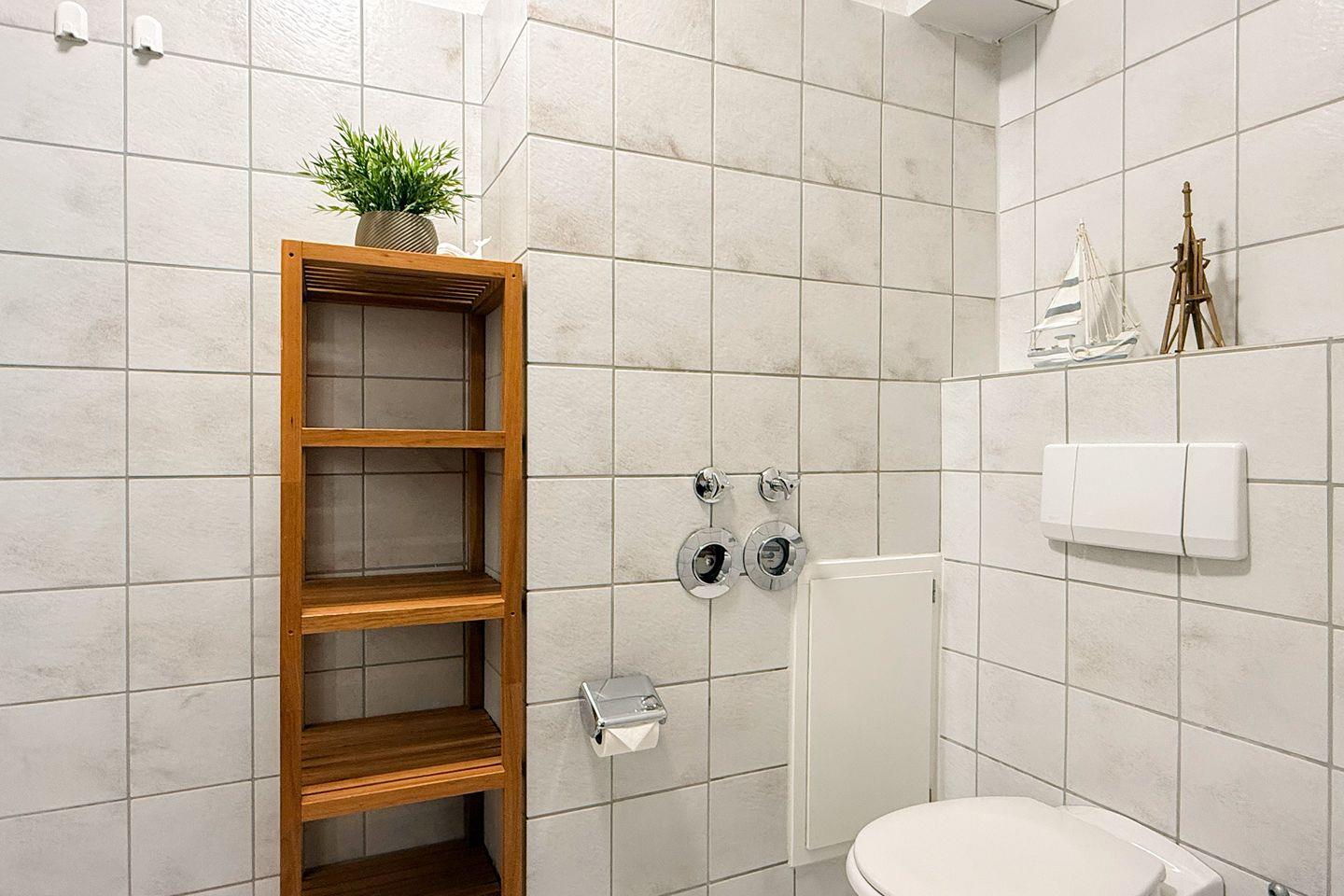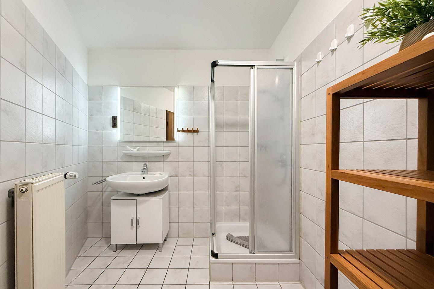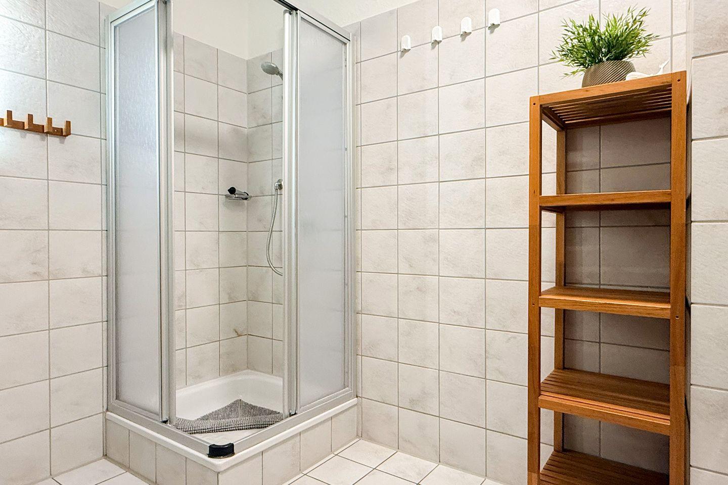 Das Badezimmer ist funktional und komfortabel eingerichtet und verfügt über WC, Waschbecken, Spiegel, Föhn sowie eine Dusche. Für längere Aufenthalte besonders praktisch: Waschmaschine und Trockner stehen Dir zur gemeinschaftlichen Nutzung zur Verfügung, ein Wäscheständer ist ebenfalls vorhanden.