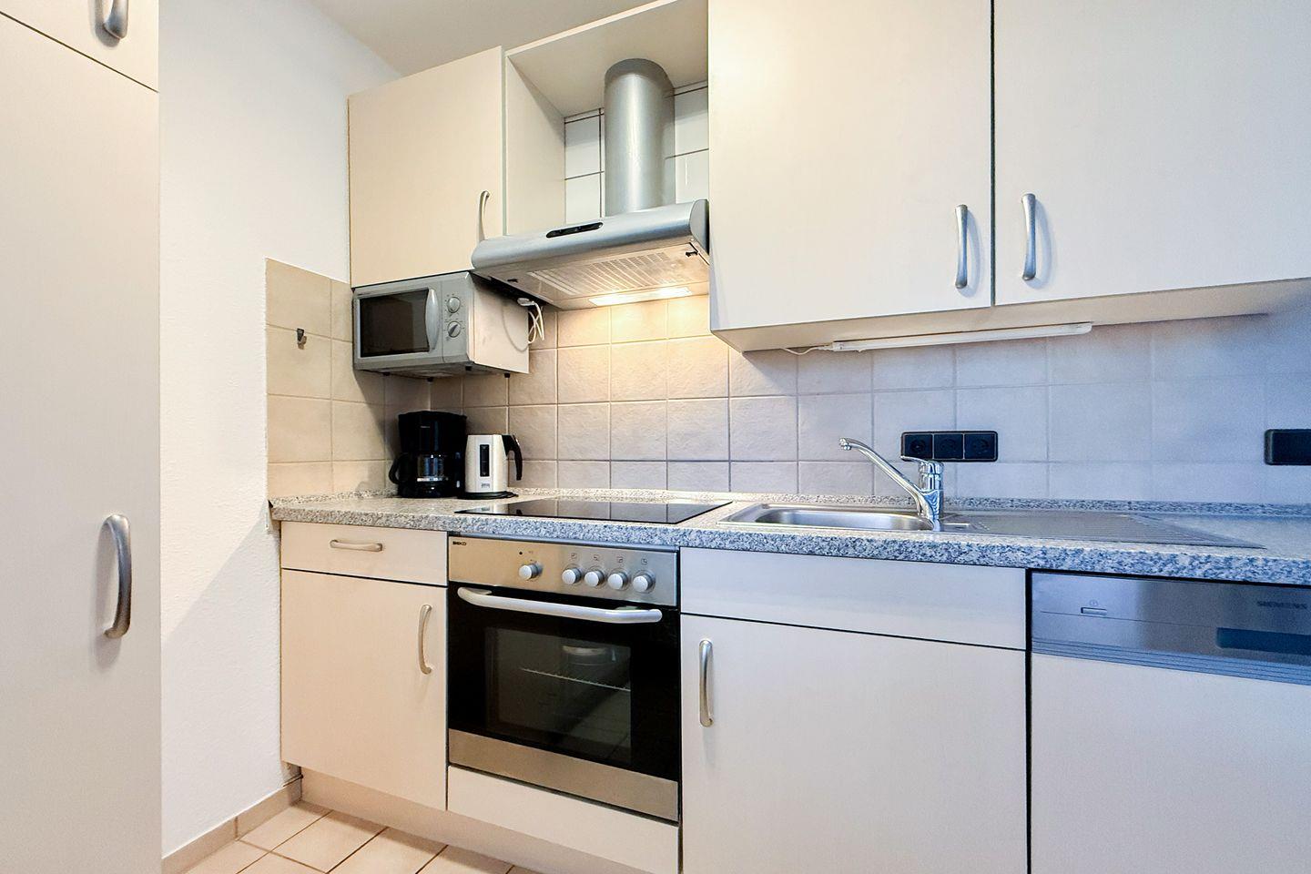 Residenz Meeresbrandung Ferienwohnung 14 (RM14) in Cuxhaven: 56 m², 2 Zimmer im 1. Stock für bis zu 4 Personen, Nichtraucher, Kinder willkommen. Offene Küche zum Wohnzimmer mit Ceranherd, Backofen, Spülmaschine und Mikrowelle. Überdachter Balkon mit Strandblick, nur 10 m bis Meer und Sandstrand, Strandkorb am Strand von Mai bis Mitte Oktober inklusive. Aufzug, WLAN, Privatparkplatz, beheizter Indoor-Pool, Sauna sowie gemeinschaftliche Waschmaschine/Trockner.