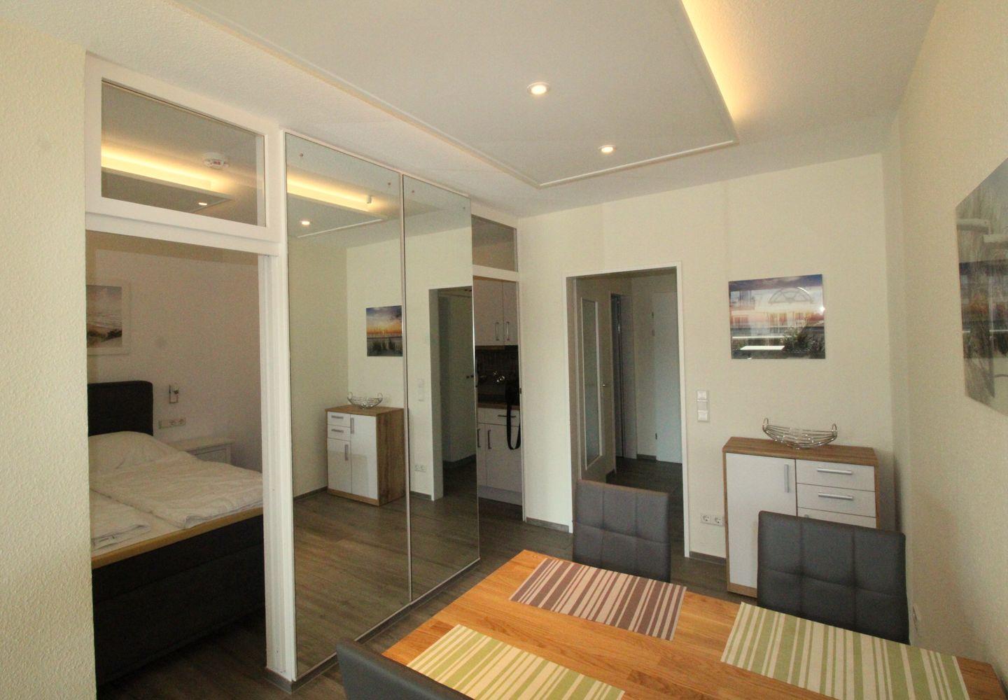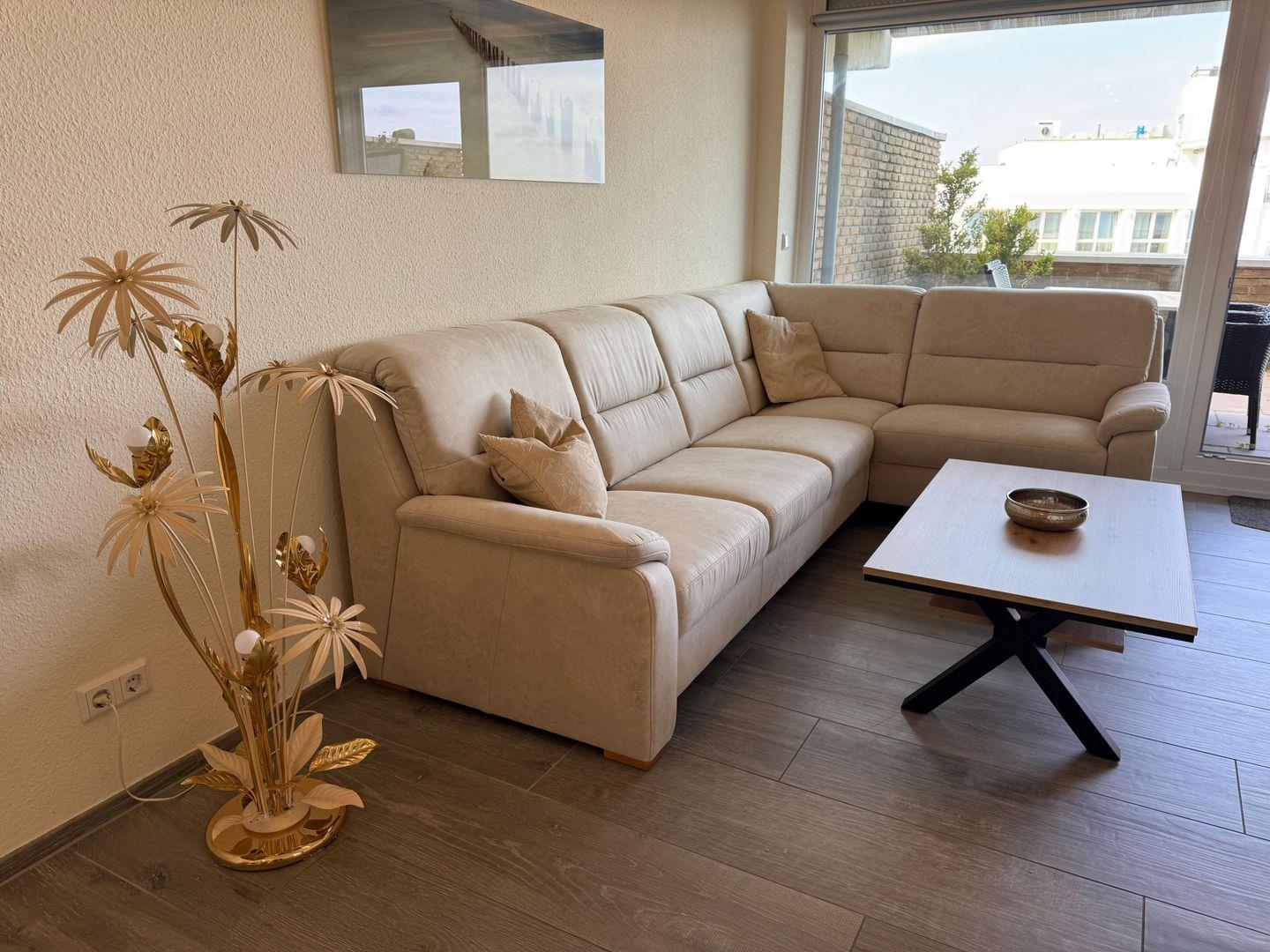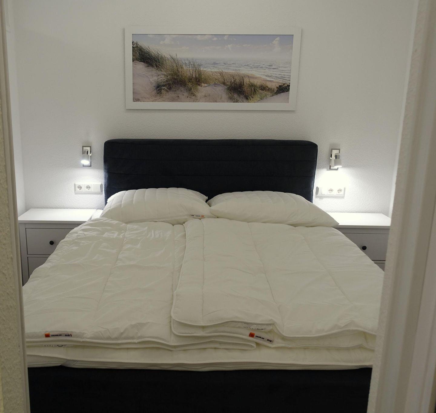 Die Nichtraucherwohnung verfügt über zwei Zimmer mit separatem Schlafzimmer und einem großzügigen Wohnzimmer mit tollem, bequemem Ecksofa. Insgesamt stehen bis zu vier Schlafmöglichkeiten zur Verfügung. Im Schlafzimmer sorgt ein komfortables Boxspringbett für erholsamen Schlaf. Die Wohnung ist durchgehend mit Fliesenboden ausgestattet und damit auch allergikerfreundlich. Zur Unterhaltung stehen Kabel-TV (digital), Radio und WLAN bereit.