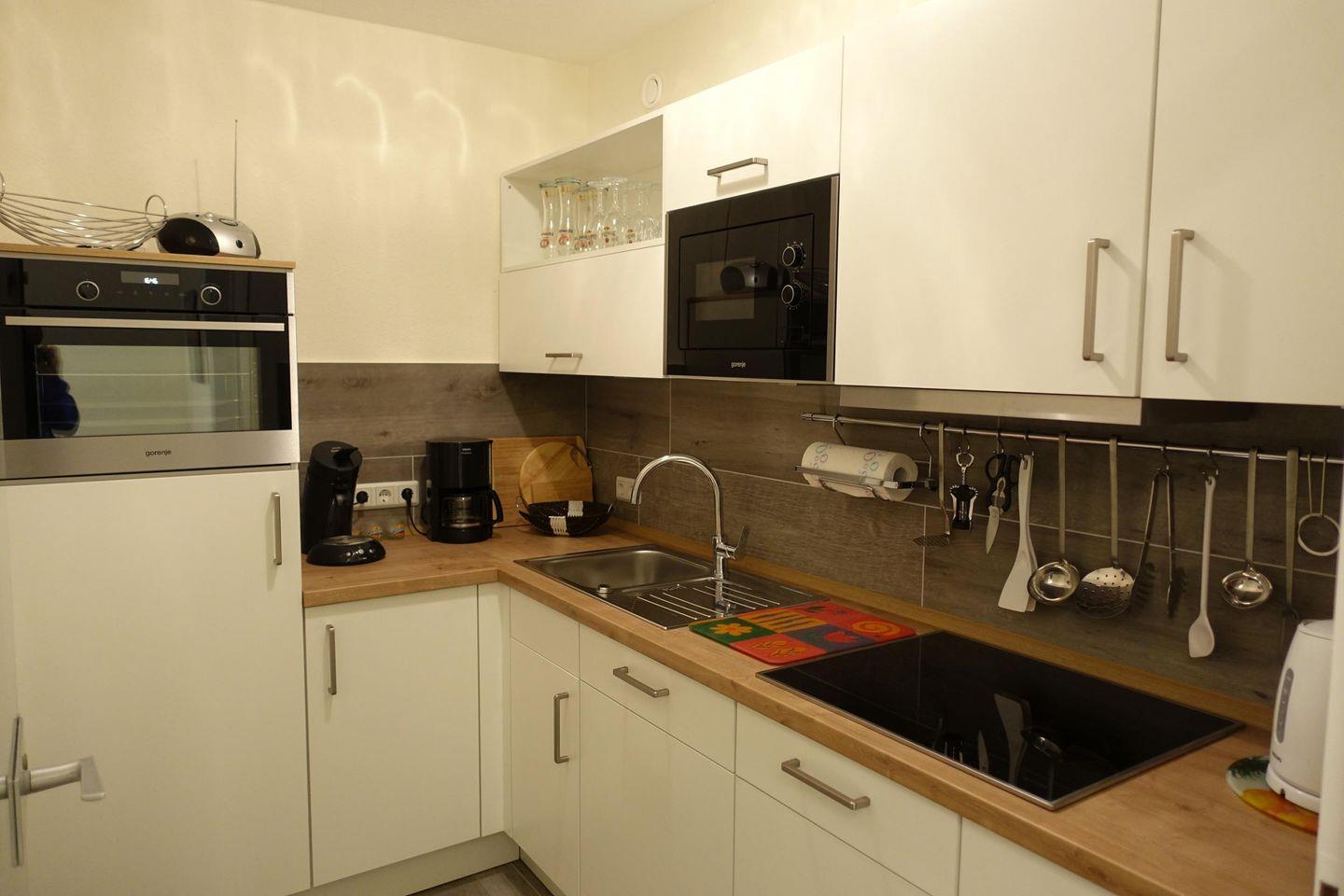 Die geschlossene Küche ist vollständig ausgestattet mit Ceranherd, Backofen, Mikrowelle, Spülmaschine, Kühlschrank mit Gefrierfach, Kaffeemaschine, Wasserkocher, Toaster sowie Geschirr und Küchenutensilien. Ein Essbereich ist vorhanden.