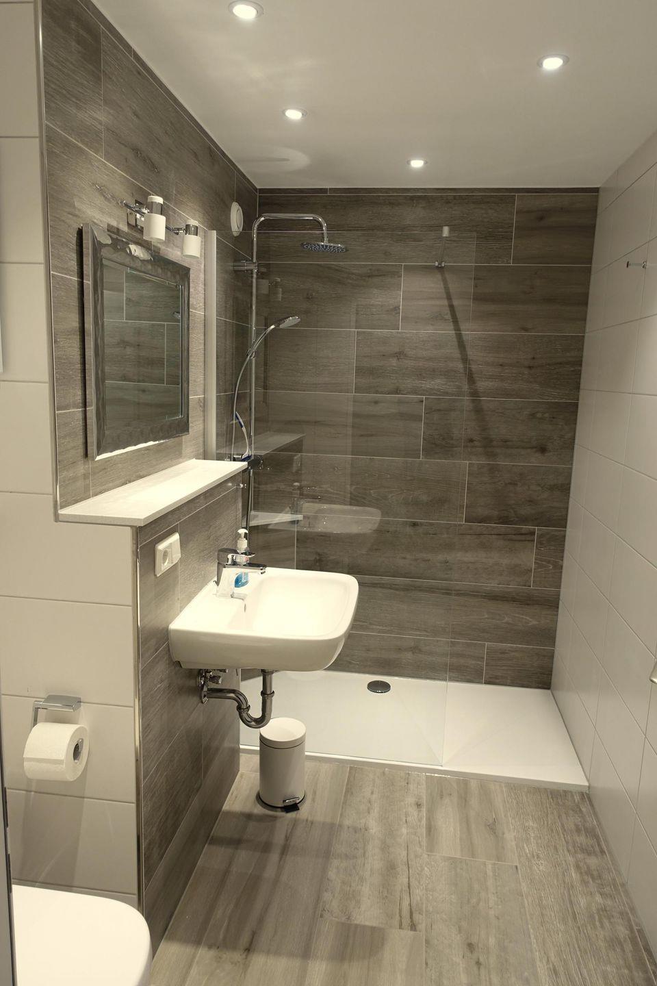 Das moderne Badezimmer bietet eine bodengleiche Dusche, WC, Waschbecken, Spiegel, Kosmetikspiegel und Haartrockner. Waschmaschine, Trockner und Wäscheständer stehen gemeinschaftlich zur Verfügung.