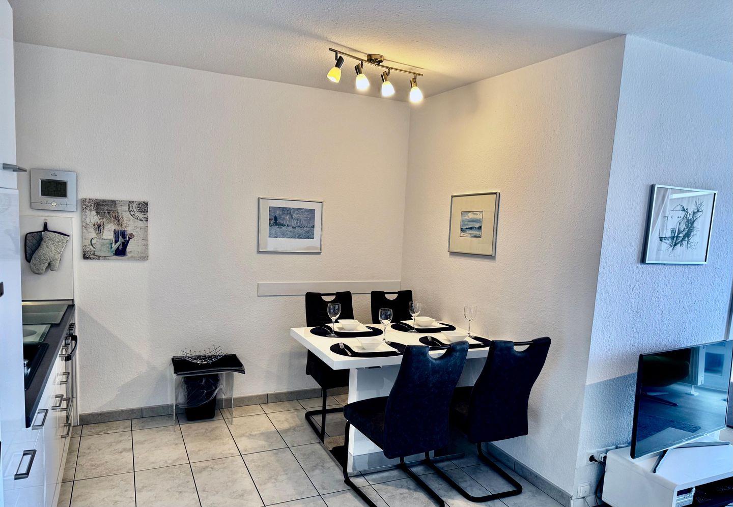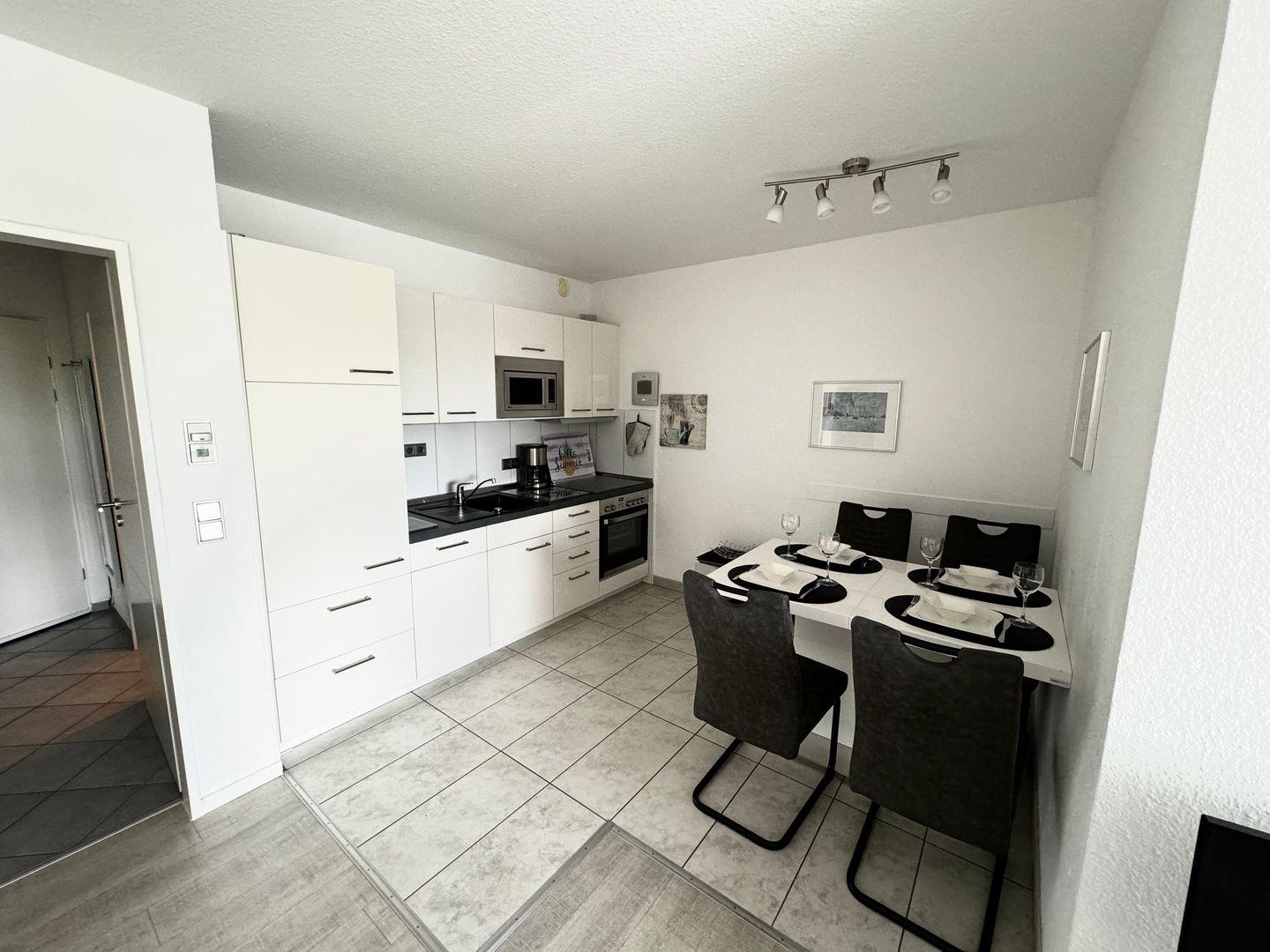 Die offene Küche ist modern und vollständig ausgestattet mit Ceranherd, Backofen, Mikrowelle, Kühlschrank mit Gefrierfach, Spülmaschine, Senseo Pad-Kaffeemaschine, zusätzlicher Filterkaffeemaschine, Wasserkocher, Toaster sowie sämtlichen Küchenutensilien. Der angrenzende Essbereich lädt zu gemeinsamen Mahlzeiten ein.
