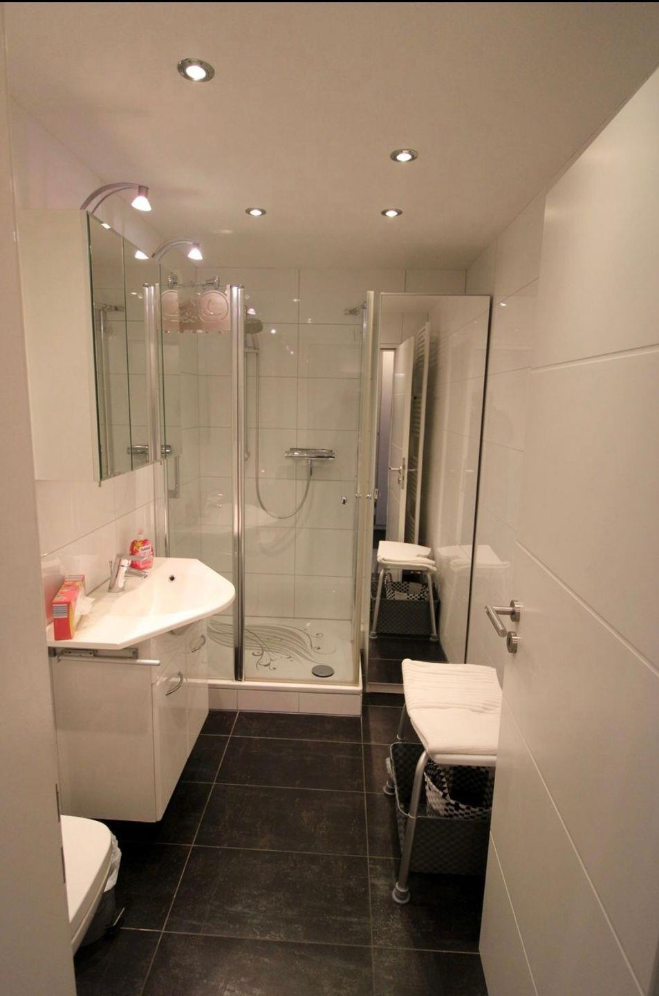 Das Badezimmer ist funktional eingerichtet mit Dusche, WC, Waschbecken, Haartrockner, Kosmetikspiegel und Ganzkörperspiegel. Zusätzliche Haushaltshelfer wie Staubsauger, Bügeleisen, Bügelbrett und Schuhschrank sind vorhanden.