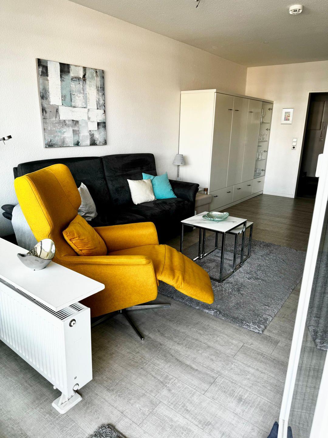 Moderne Panorama-Wohnung mit Strandnähe, Sauna, Balkon und eingeschränktem Meerblick in Cuxhaven.