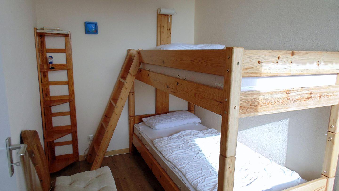 Die Ferienwohnung Nr.76 (70qm,5 OG.) ist für 4 Personen geeignet. Sie hat zwei Schlafräume, eins mit Doppelbett und eins mit Etagenbett.