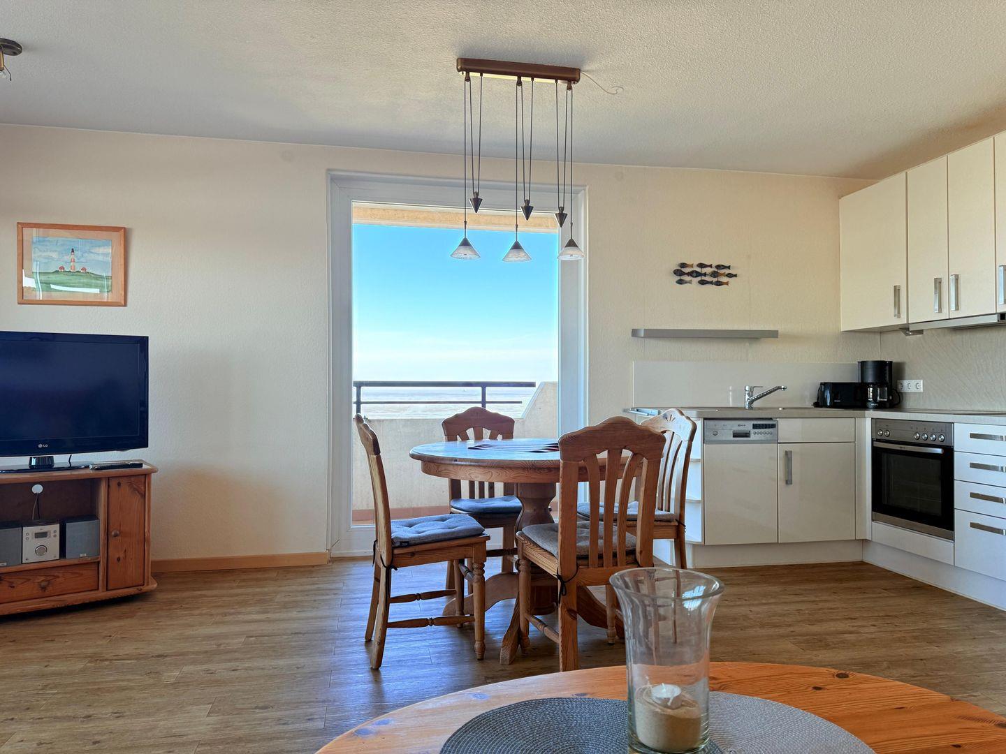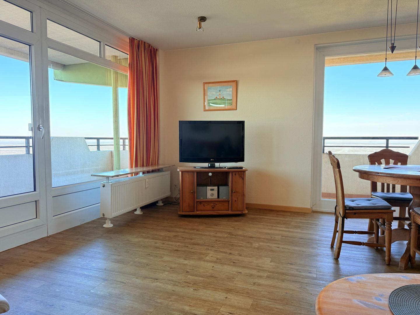 Aus der Wohnung haben Sie eine Aussicht von der Insel Neuwerk bis zur Elbmündung. Die helle moderne Küchenzeile hat auch Mikrowelle und Geschirrspüler. Im Wohnraum steht ein LCD-TV und eine "Stereo Micro Anlage". WLAN ist hier auch vorhanden. Das Bad hat eine Badewanne in der man auch duschen kann.