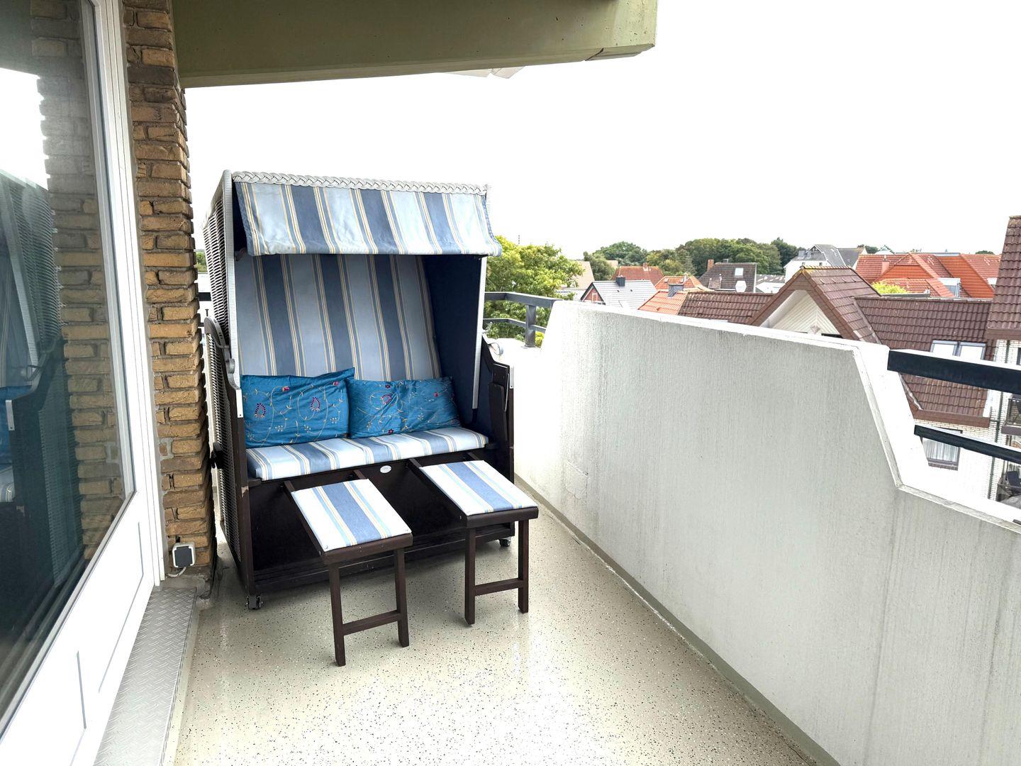 Vom Wohn- und Essbereich gelangen Sie auf den großen, überdachten Balkon mit Strandkorb und eingeschränkter Seesicht sowie Strandblick. Dank der Lage in erster Reihe sind es nur ca. 30 Meter bis zum feinen Sandstrand.