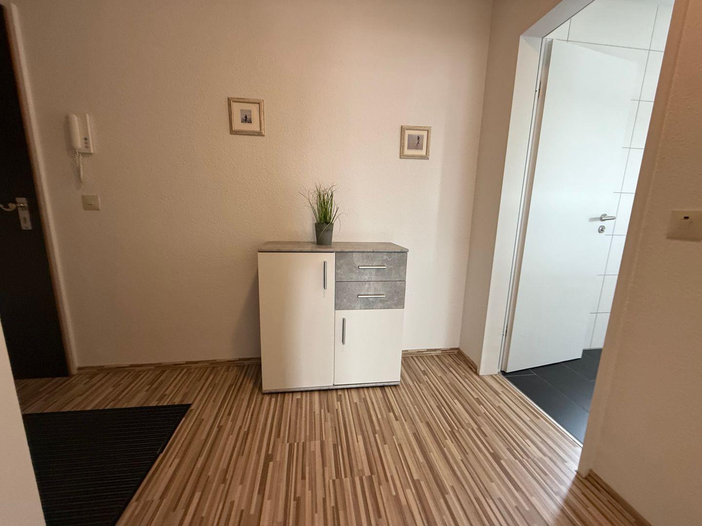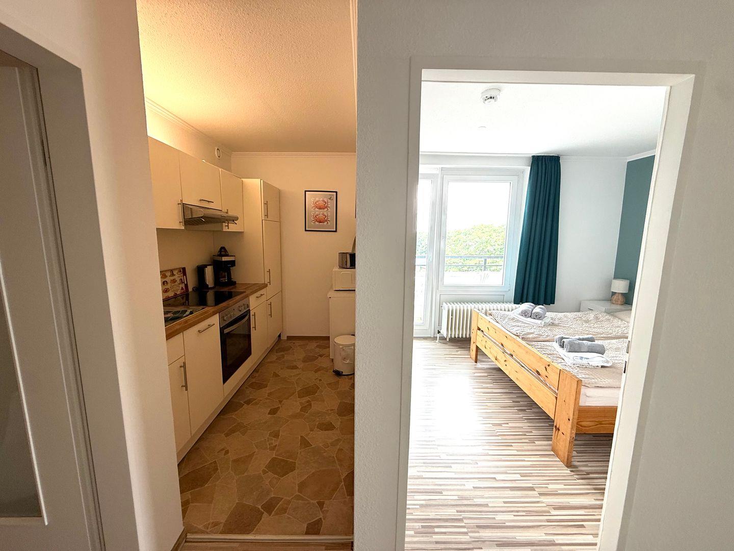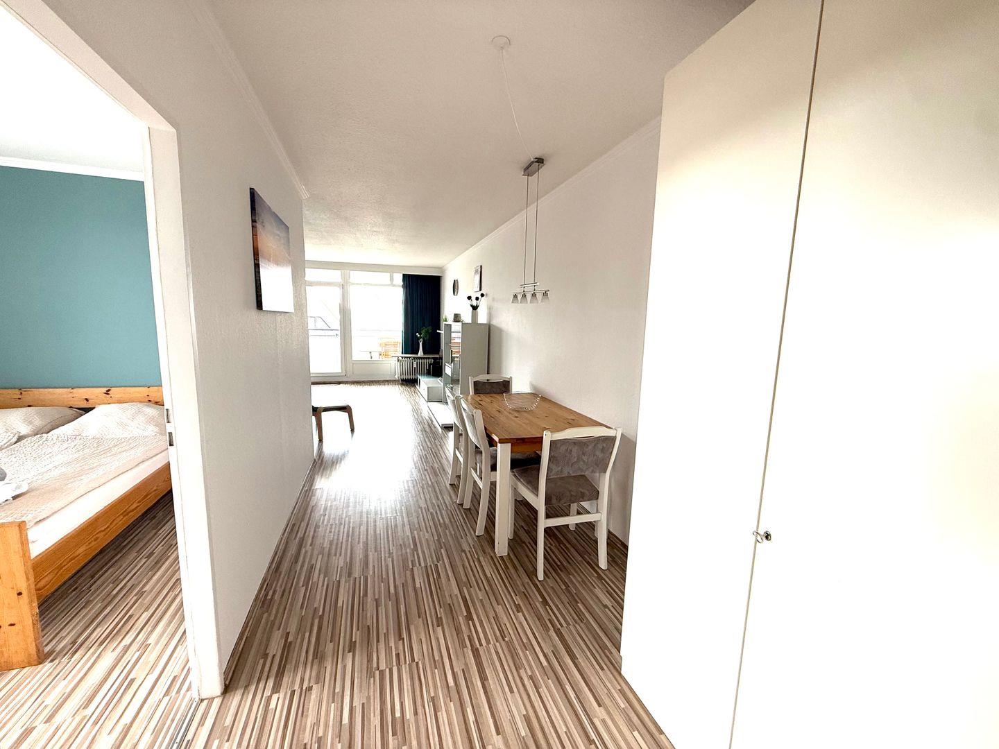 Die Wohnung verfügt über zwei Zimmer, darunter ein separates Schlafzimmer mit Laminatboden (allergikerfreundlich) und eigenem kleinen Balkon. Der Wohnbereich ist ebenfalls mit Laminatboden ausgestattet und bietet eine gemütliche Sofaecke mit bequemem Schlafsofa sowie einen zusätzlichen Sessel.
