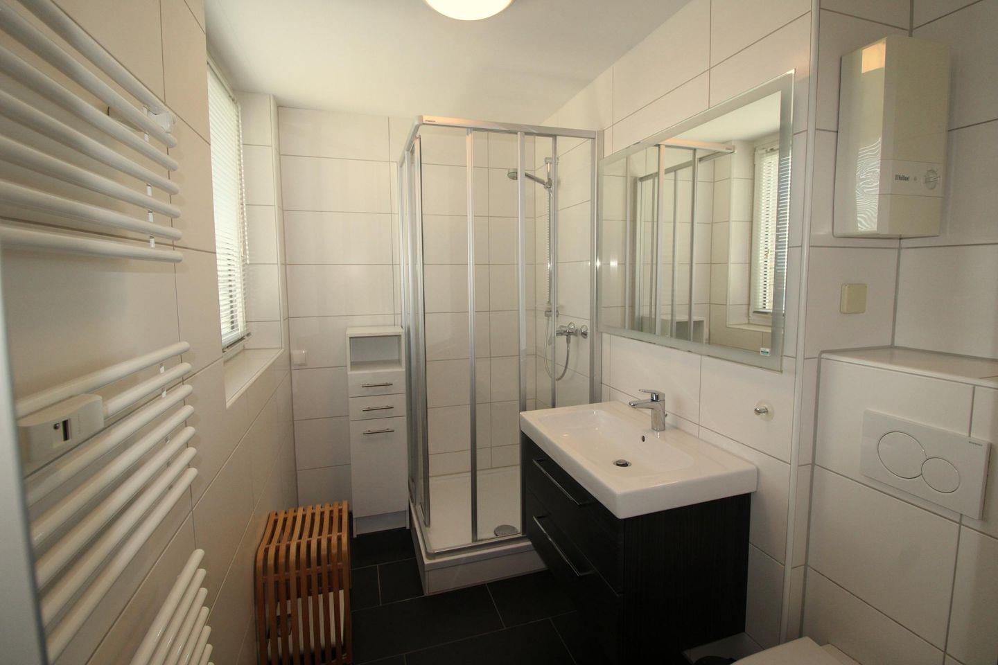 Das Tageslichtbad verfügt über eine bodengleiche Dusche, WC, Waschbecken, Kosmetikspiegel und Ganzkörperspiegel. Die Wohnung ist Nichtraucherunterkunft, allergikerfreundlich, Haustiere sind nicht gestattet. Sichtschutz an allen Fenstern sowie Rauch- und Feuermelder sorgen für Sicherheit und Privatsphäre.