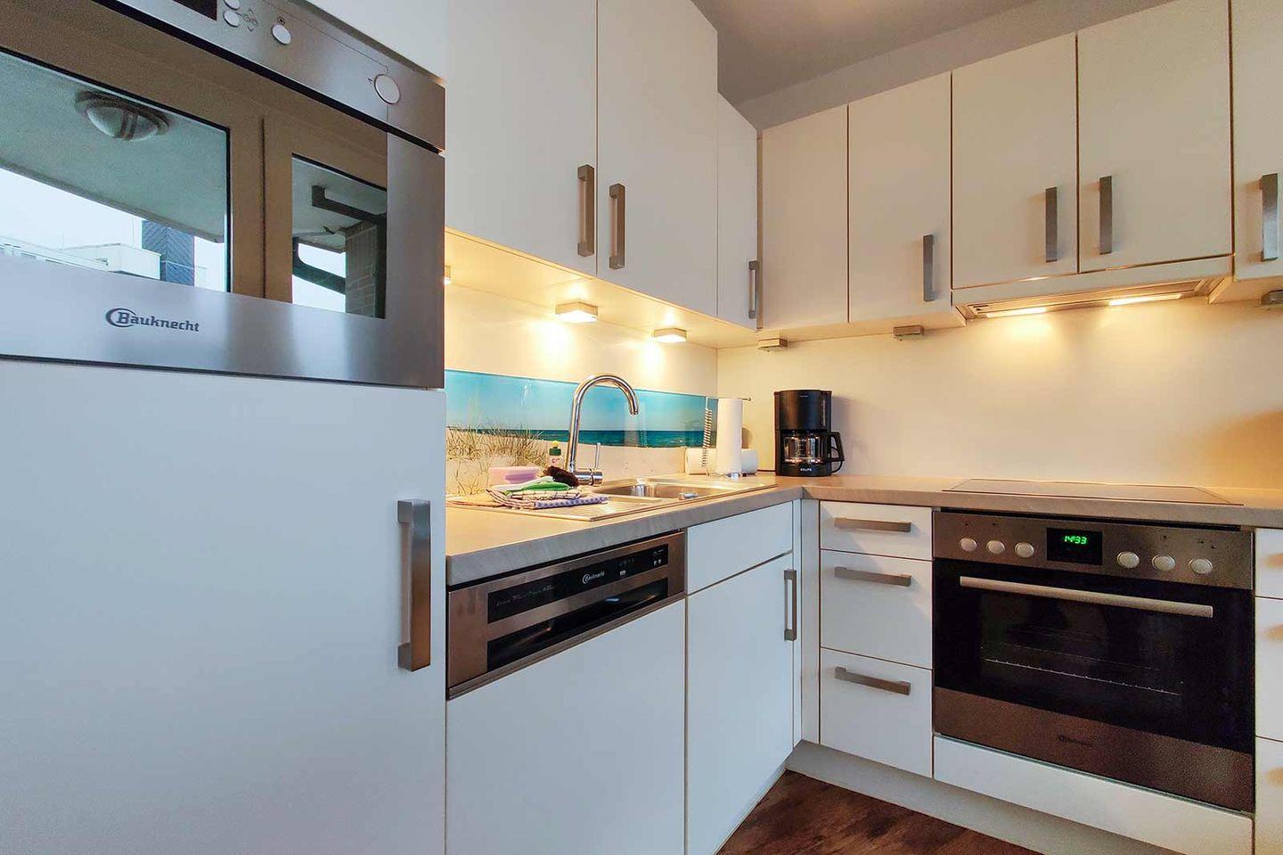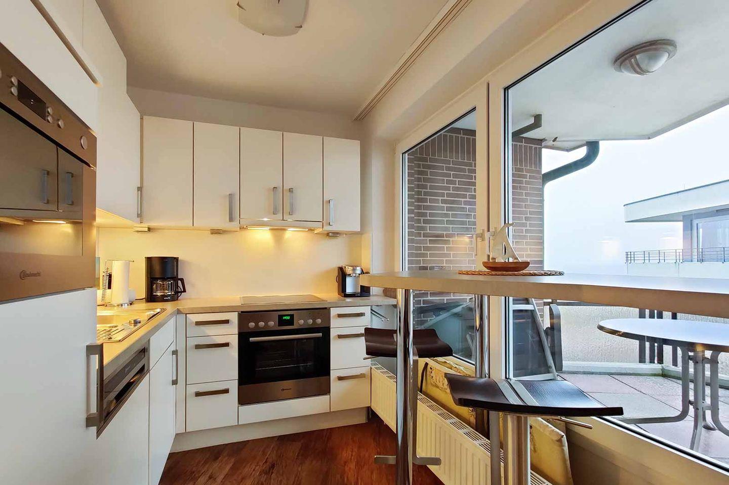 Residenz Meeresbrandung, Haus 1: Die großzügige Ferienwohnung für bis zu 4 Personen bietet aus der 3. Etage einen tollen Meerblick und ist absolut hochwertig eingerichtet. Mit der schönen Aussicht von Balkon, Küche und Wohnraum auf die Nordsee wird es nie langweilig.