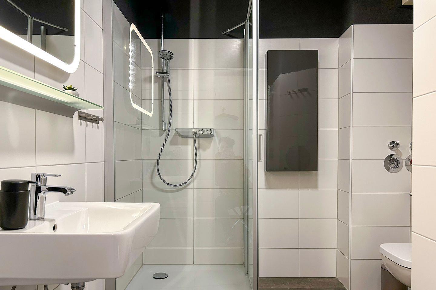 Im modernen Badezimmer finden Sie eine Dusche, ein WC, einen Haartrockner sowie einen Spiegel und weitere praktische Ausstattungsdetails. Die Nutzung einer Waschmaschine und eines Trockners ist gemeinschaftlich im Haus möglich, so dass auch längere Aufenthalte oder Familienurlaube unkompliziert gestaltet werden können. Ein Wäscheständer gehört ebenfalls zur Ausstattung der Wohnung.
