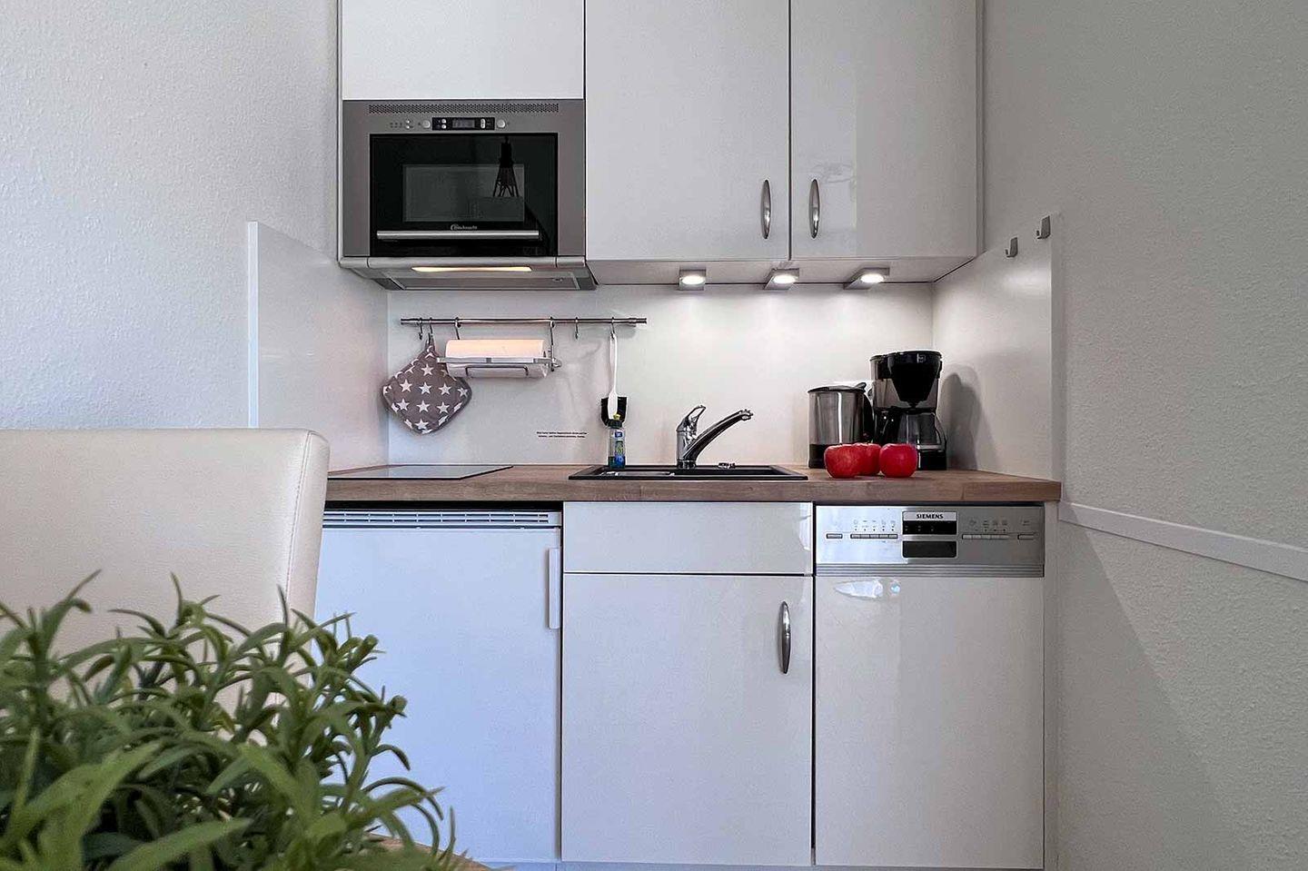 Residenz Meeresbrandung, Haus 1: Dieses schöne 1-Raum-Appartement mit kleinem Sonnenbalkon direkt an der Kurpromenade von Duhnen gelegen ist mit hochwertigen Boxspringbetten mit Emma-Hybrid 25-Matratzen (2 x 80 x 200 cm), moderner Einbauküche, kleinem Essplatz und gemütlicher Sofaecke ausgestattet. Der moderne 40-Zoll-Flat-Screen TV von Panasonic lässt sich in alle Richtungen schwenken.