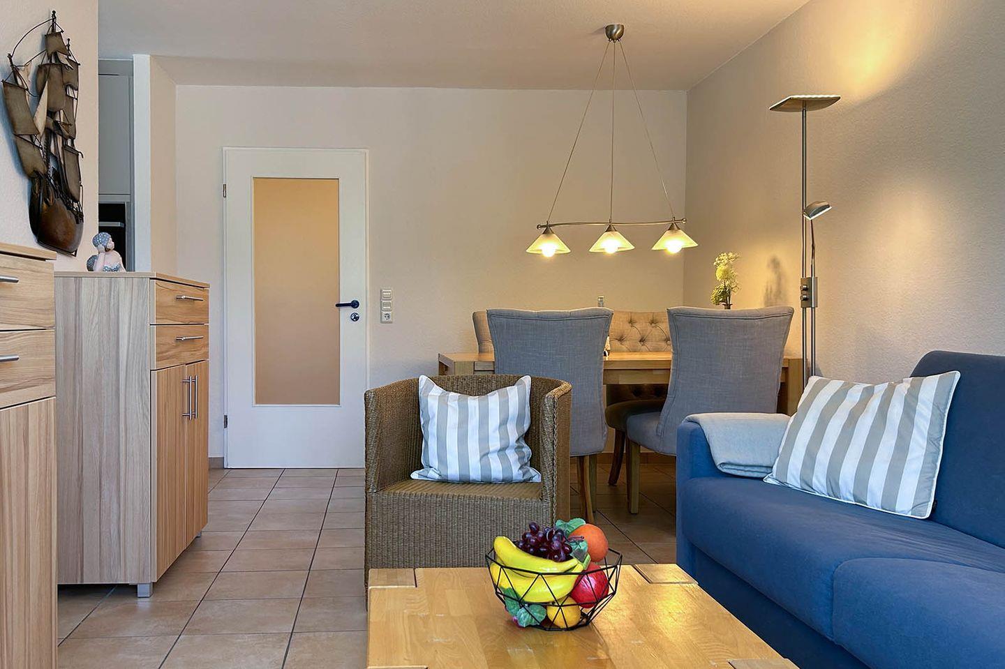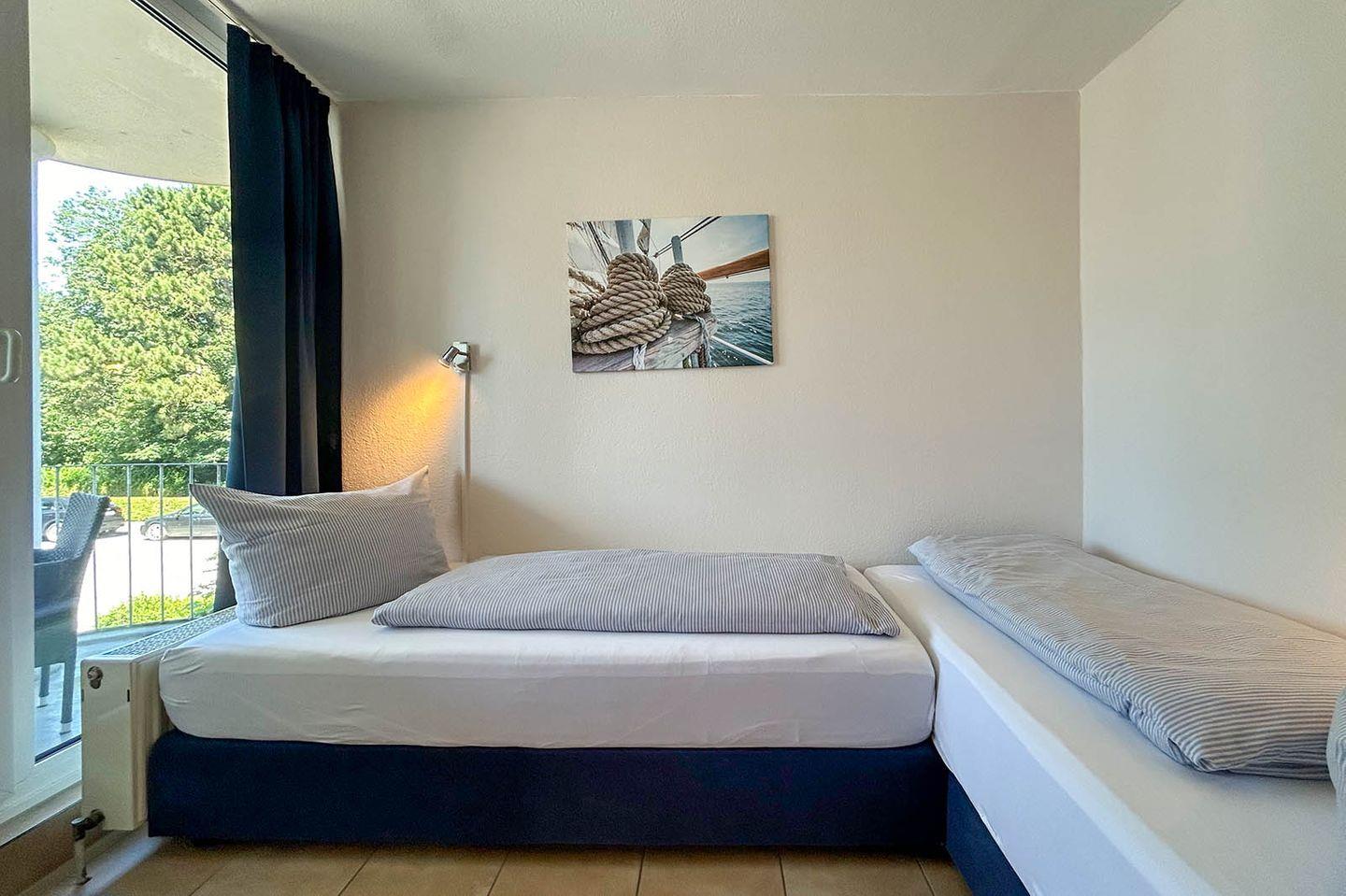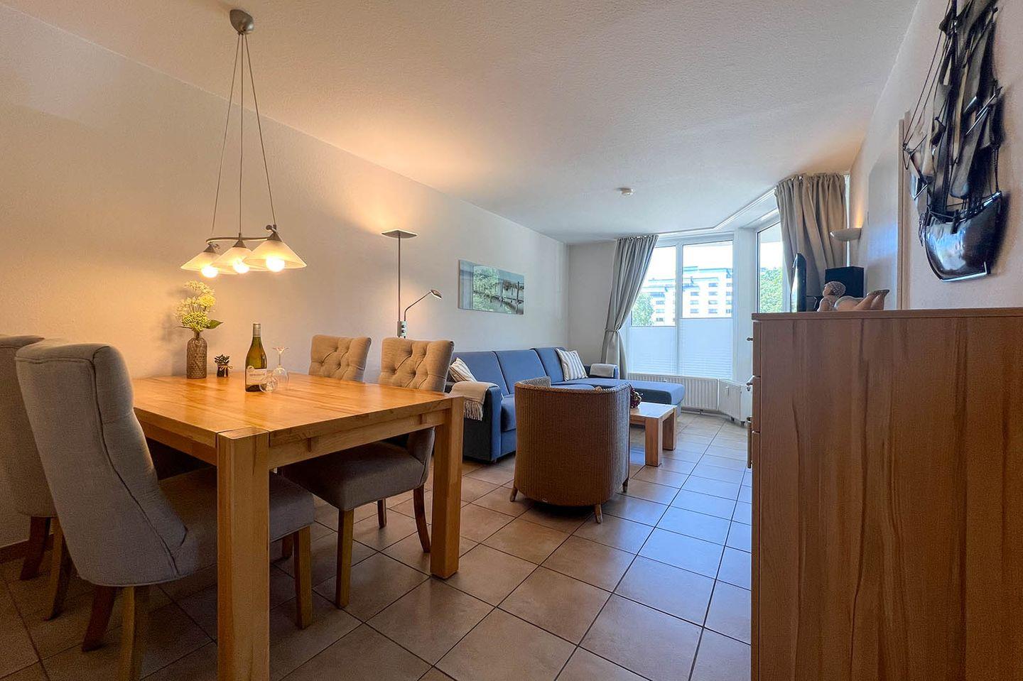 Sie wohnen in unmittelbarer Strandnähe in einem schönen 2-Zimmer Appartement für bis zu 4 Personen mit großem Westbalkon auf ca. 40 m² Wohnfläche. Das kleine Schlafzimmer mit getrennten Betten (90x190 cm) verfügt über einen eigenen Zugang zum Balkon. Der Wohnraum ist ausgestattet mit einem bequemen Essplatz sowie einer Doppelbett-Schlafcouch mit eigener Matratze (160x195 cm). Ein modernes Duschbad mit Fenster, Einbauschränke im Eingangsbereich und ein bequem zugänglicher Tiefgaragenplatz (Durchfahrtshöhe: 180 cm) für Ihren PKW mit Fahrstuhl zur Wohnung runden das Angebot ab.