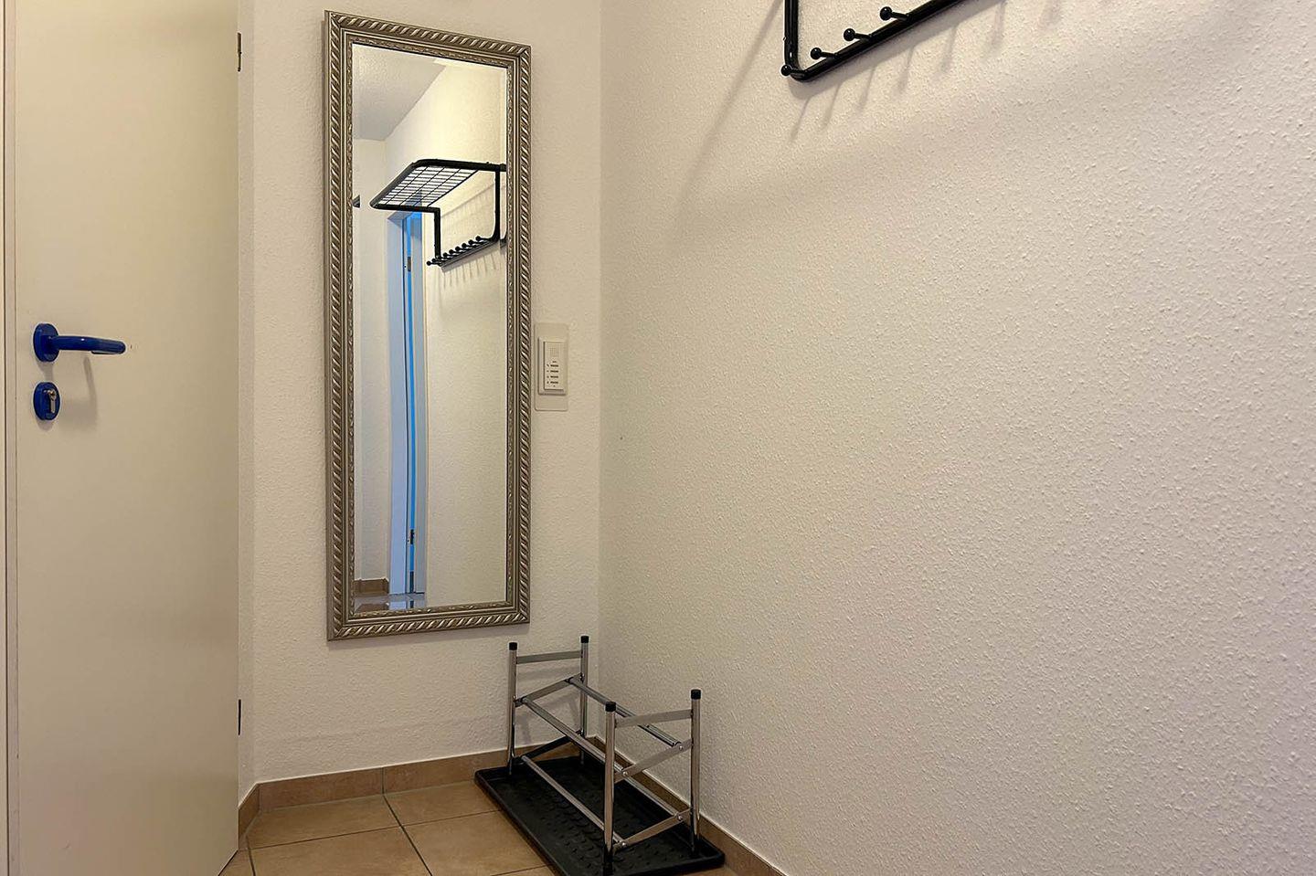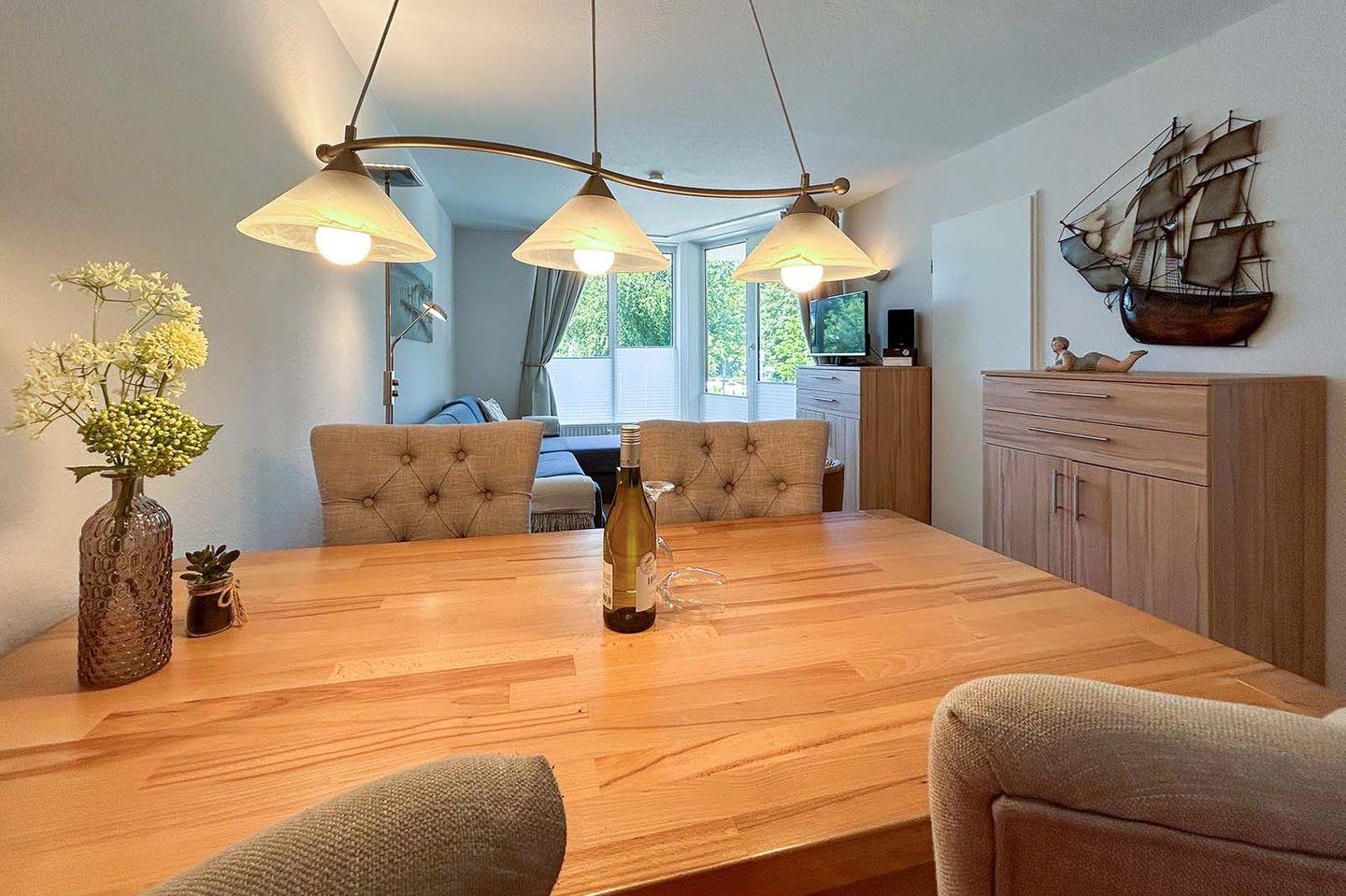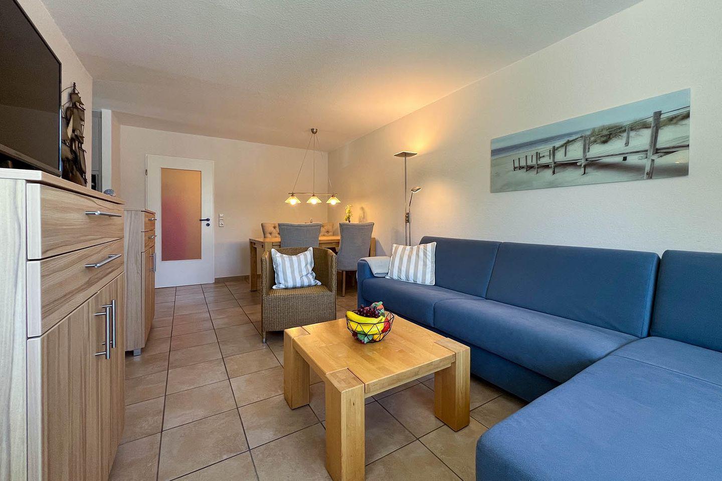 Sie wohnen in unmittelbarer Strandnähe in einem schönen 2-Zimmer Appartement für bis zu 4 Personen mit großem Westbalkon auf ca. 40 m² Wohnfläche. Das kleine Schlafzimmer mit getrennten Betten (90x190 cm) verfügt über einen eigenen Zugang zum Balkon. Der Wohnraum ist ausgestattet mit einem bequemen Essplatz sowie einer Doppelbett-Schlafcouch mit eigener Matratze (160x195 cm). Ein modernes Duschbad mit Fenster, Einbauschränke im Eingangsbereich und ein bequem zugänglicher Tiefgaragenplatz (Durchfahrtshöhe: 180 cm) für Ihren PKW mit Fahrstuhl zur Wohnung runden das Angebot ab.