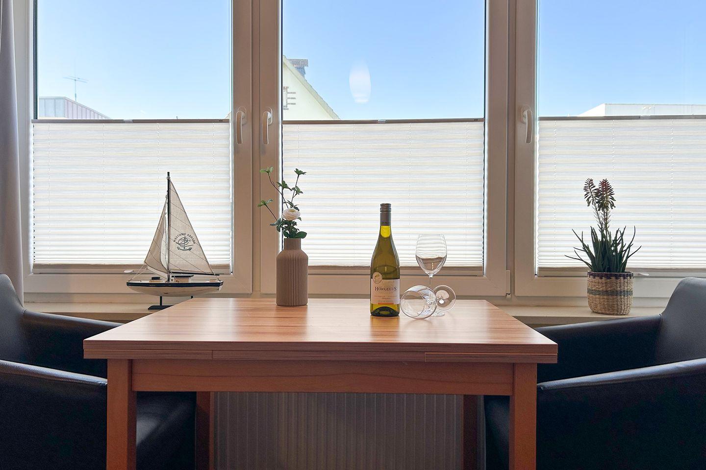 Der Platz im Wohnraum ist perfekt genutzt: Vom Essplatz am Fenster sehen Sie die Nordsee und vom bequemen Doppelbett aus können Sie Fernsehen schauen. Im Flur ist eine Küchenzeile vorhanden. Das Badezimmer mit Dusche hat ein Fenster. WLAN steht Ihnen während des Urlaubs gratis zur Verfügung.