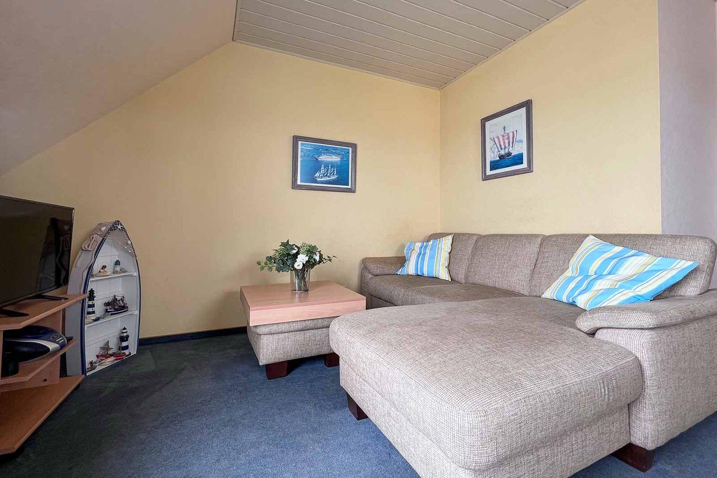 Die Fewo ist ideal für bis zu 4 Personen geeignet: Beide Schlafzimmer sind mit einem Doppelbett ausgestattet. Der eine Schlafraum ist ein Durchgangszimmer. Im Wohnraum befindet sich auch die offene Küche sowie der Zugang zum Balkon mit Meerblick. Das Badezimmer mit Dusche hat ein Fenster. WLAN ist für Sie in der Unterkunft inklusive. Kurpromenade, Strand und gastronomischen Angeboten erreichen Sie nach nur wenigen Metern zu Fuß.