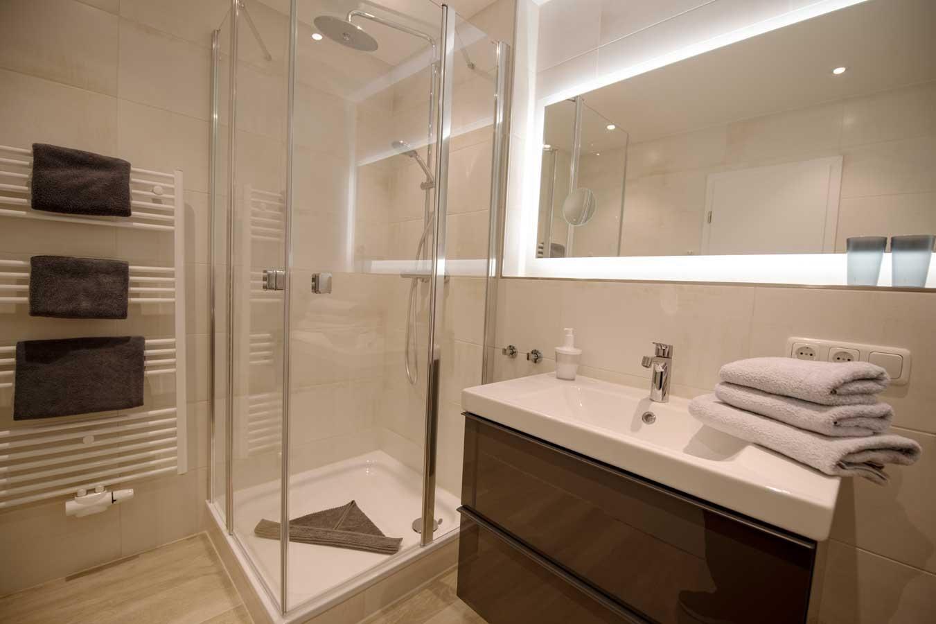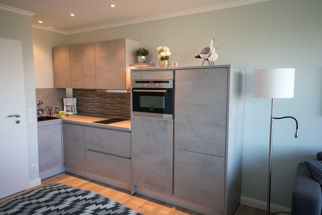 Im Wohnraum befinden sich ein Essplatz mit Polstersesseln direkt am Fenster, eine gemütliche Couch mit großem TV sowie ein hochwertiges Boxspring-Doppelbett. Die offene Küche bietet allen Komfort für die Selbstversorgung. Das große Duschbad ist mit flacher Duschtasse sowie WC in Komforthöhe und Handtuchheizung ausgestattet.
